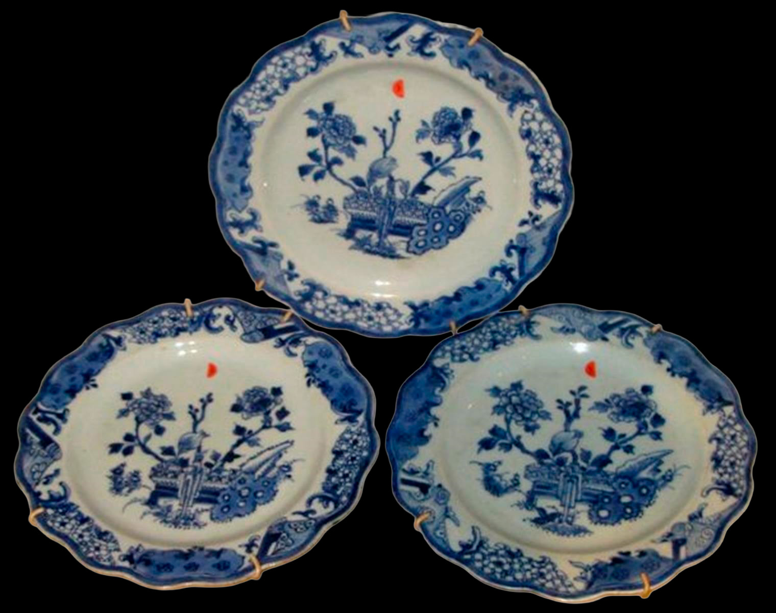 Три китайские керамические блюда с горшком и растениями в центре и с волнистыми краями.