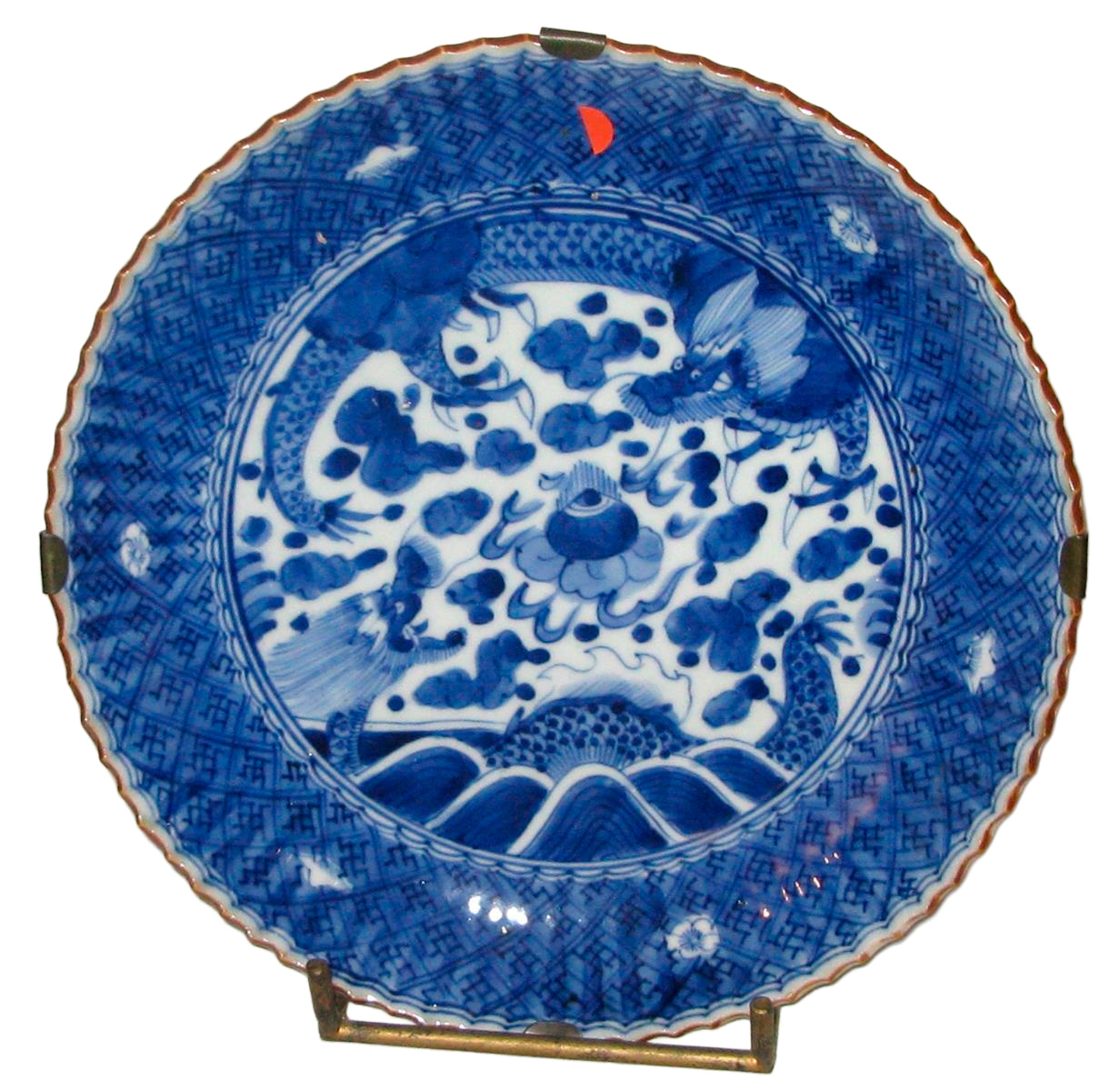 Бело-голубая китайская керамическая тарелка, с фигурами драконов в центре. XVIII век