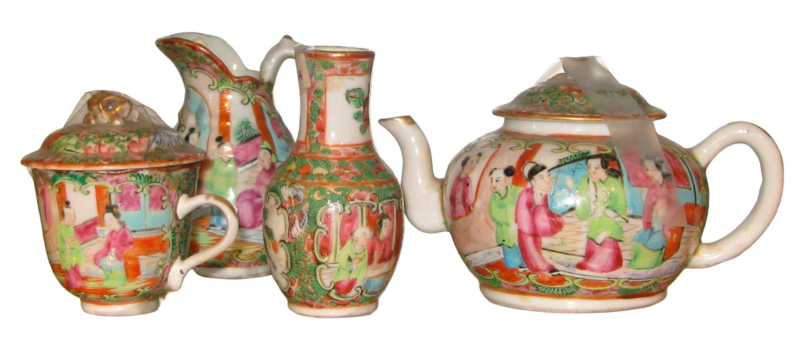 Кантонский фарфоровый чайный набор: чайник с крышкой, сахар с крышкой, молоко и Джаррита. XIX век