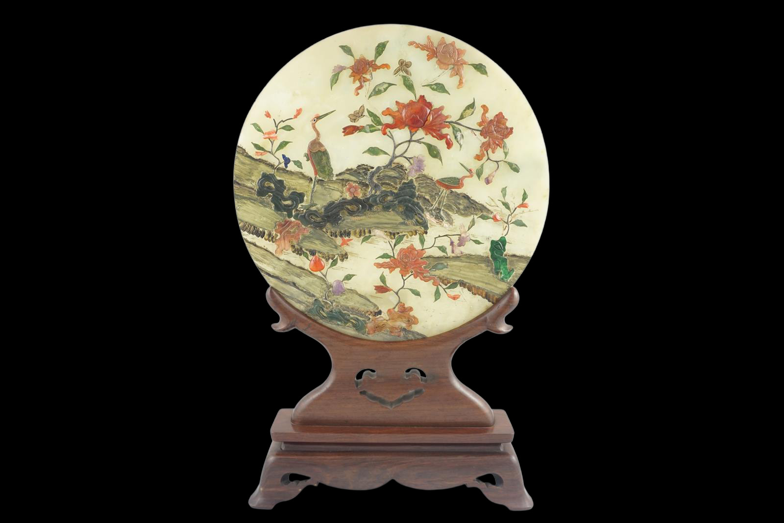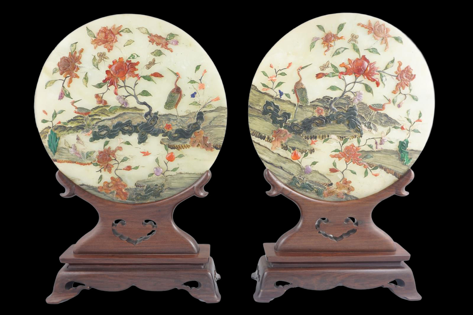 Пара нефритовых пластин с полудрагоценными каменными приложениями, нефритом, кораллами, аметистом. С деревянным основанием.
