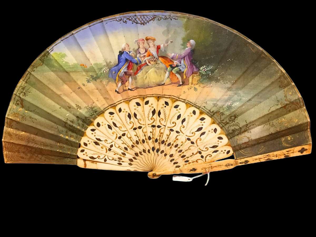 Exquisito abanico del siglo XVIII con varilla de hueso e incrustaciones de plata y oro, acompañado de un país de tela pintado a mano que representa cuatro personajes en una composición armoniosa y detallada. Cada elemento refleja la maestría artesanal de la época y la combinación de materiales nobles con pintura manual, convirtiéndolo en una pieza decorativa y de colección de gran valor histórico y estético.