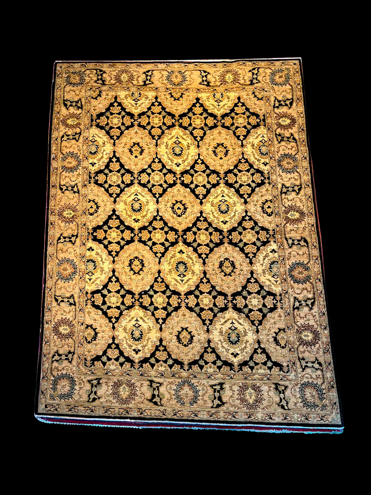 Su característica principal es el patrón de red hipnótico, donde medallones circulares en tonos crema se entrelazan con estructuras oscuras, creando un contraste arquitectónico que aporta profundidad y carácter a cualquier espacio. La lana de alta densidad asegura durabilidad, suavidad y un brillo natural único, reflejo del trabajo artesanal de Farahan.