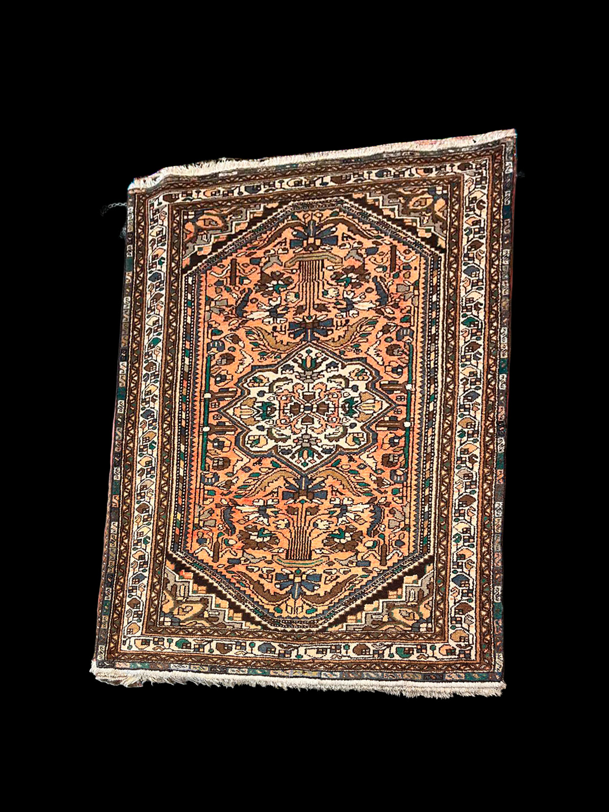 Destaca por su medallón central romboidal, que organiza un elegante campo en tonos salmón y terracota, aportando calidez y armonía visual. El diseño incorpora el clásico motivo Herati estilizado, dispuesto con precisión geométrica, mientras que las orlas en azul marino y crema generan un contraste sofisticado que enmarca la composición.