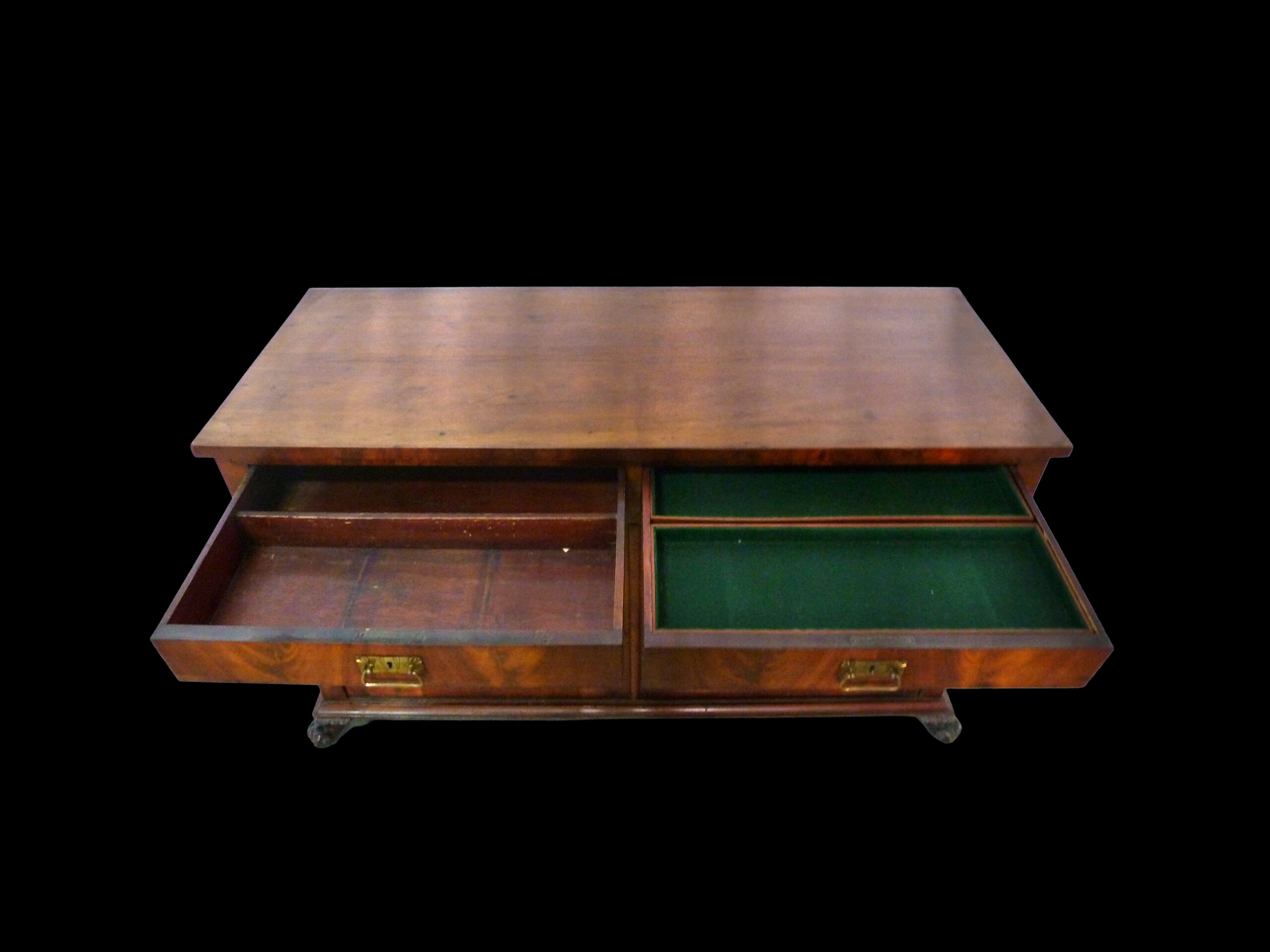 El mueble cuenta con dos cajones superiores y dos puertas inferiores, ofreciendo un amplio espacio de almacenamiento mientras mantiene una estética equilibrada y elegante. La caoba de alta calidad aporta durabilidad, resistencia y una cálida tonalidad natural, que realza la presencia y el carácter de la pieza.