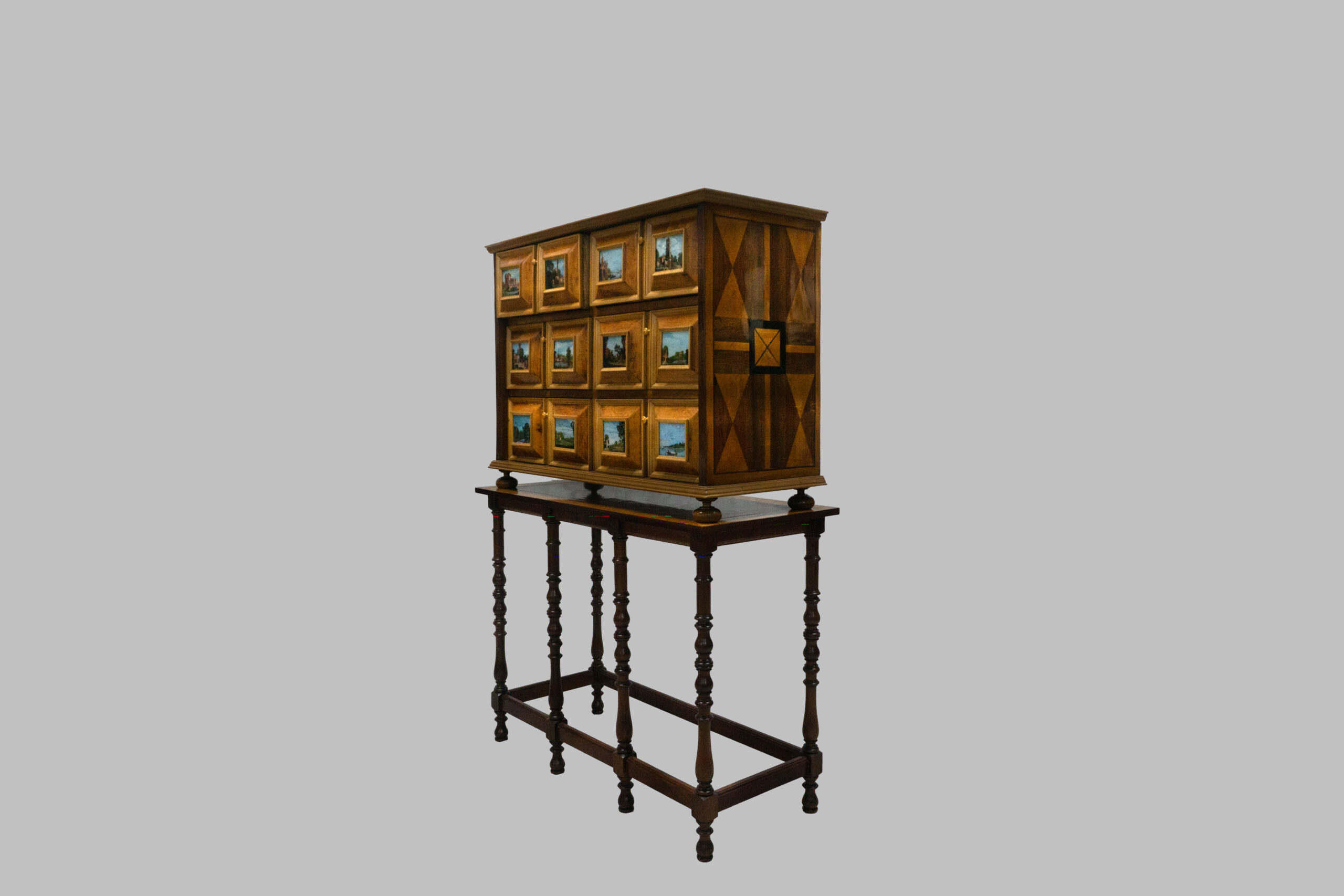 La pieza presenta una estructura estilizada con pies de cebolla, un elemento característico que aporta solidez y una estética distintiva. La combinación de limoncillo y nogal crea un atractivo contraste de tonalidades, realzando la riqueza visual y la calidad de la ebanistería. Su diseño vertical la convierte en un mueble funcional y decorativo, ideal para almacenamiento y exhibición.