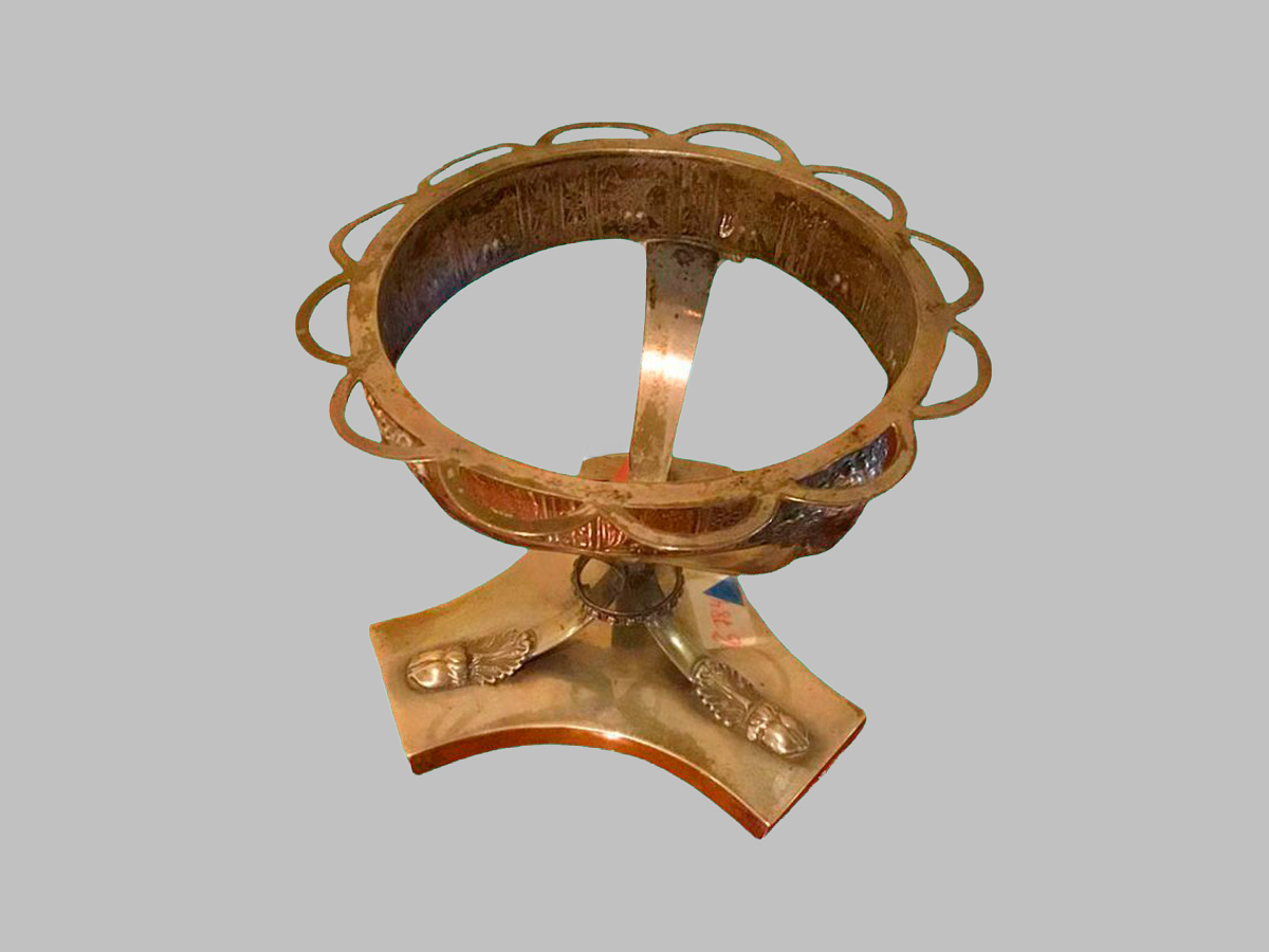 Original base de plata para cuenco, decorada con tres cabezas humanas y sostenida por tres patas, típica del diseño artístico del siglo XVIII. Con una altura de 11,5 cm, es una pieza única.