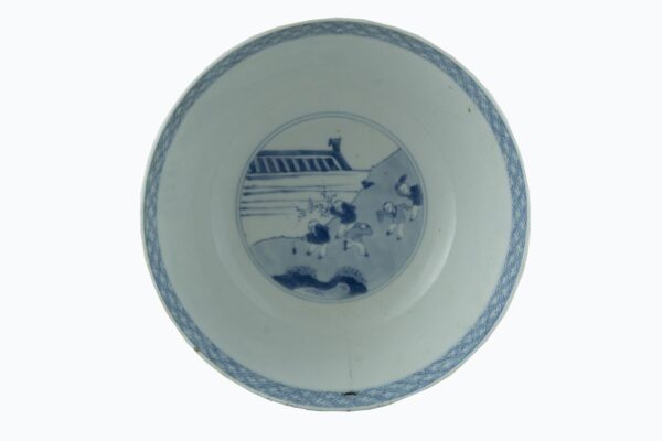 Bowl de porcelana Cantón blanco y azul, decorado el interior con cinco personajes orientales al fondo y cenefa en el borde, el exterior está decorado con escenas cotidianas también orientales con animales y personajes y firma o sello en la base.