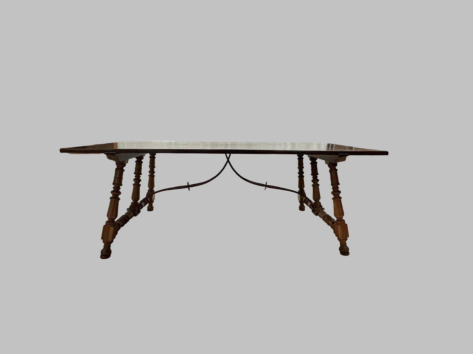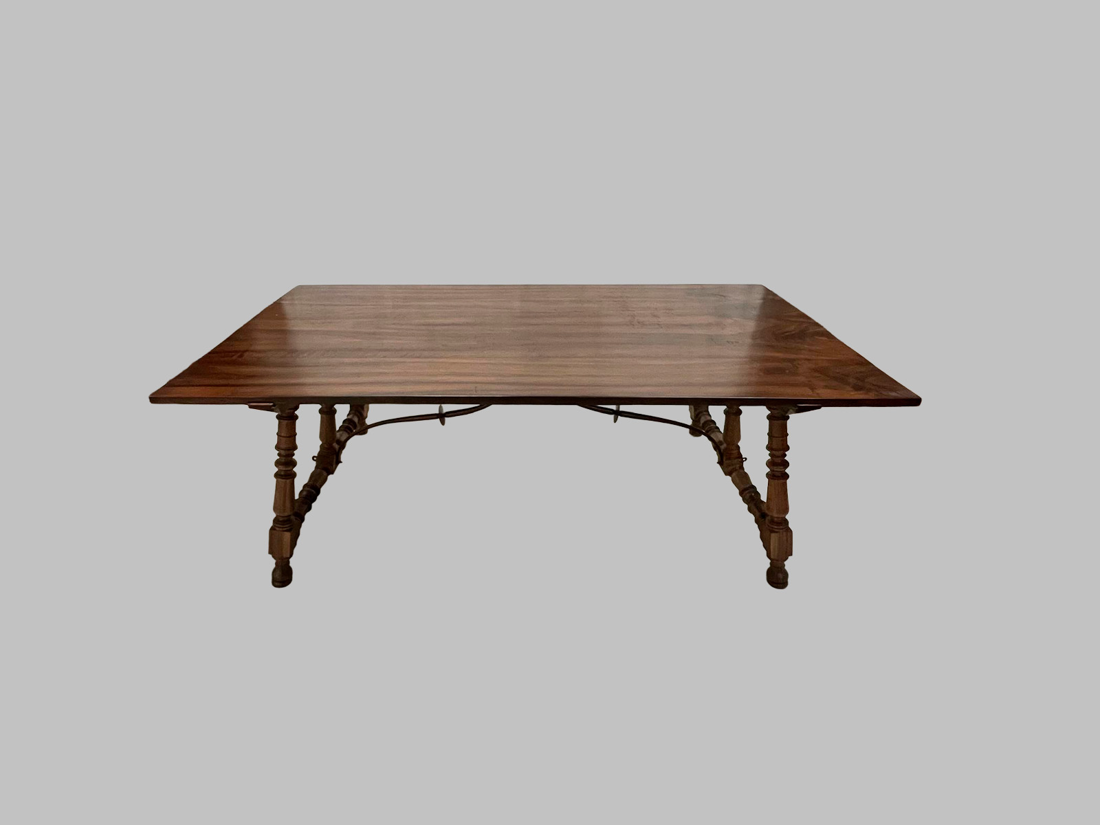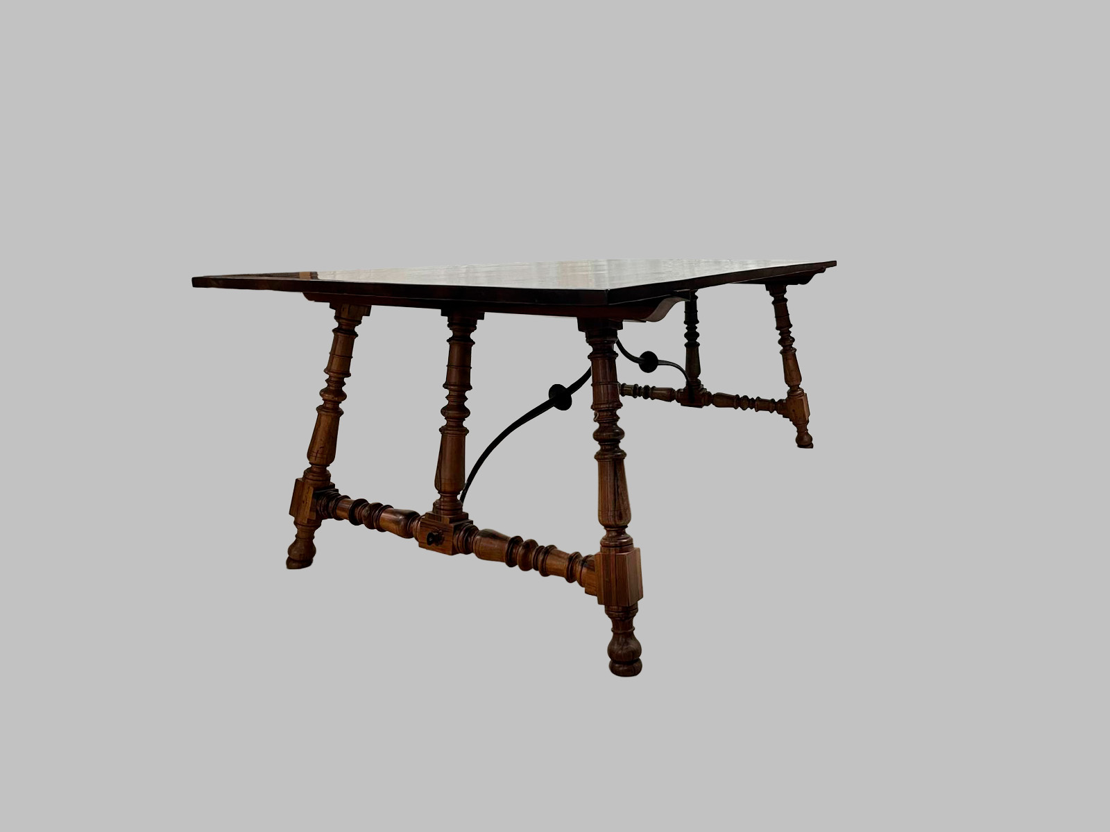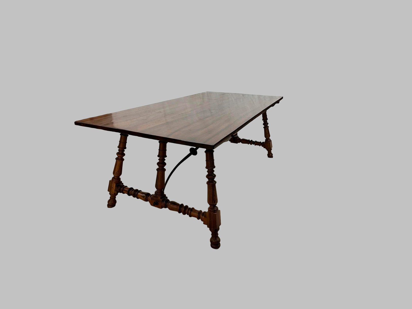 La pieza presenta una estructura de seis patas, aportando gran estabilidad y presencia, junto con un diseño robusto y proporcionado, característico del mobiliario del estilo Luis XIII. La madera de nogal, noble y resistente, ofrece durabilidad, calidez y una rica veta natural, resaltando la calidad del trabajo artesanal.