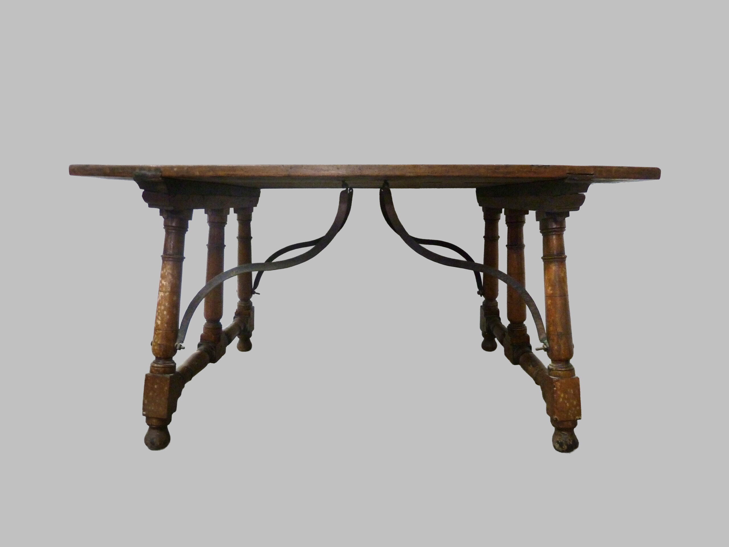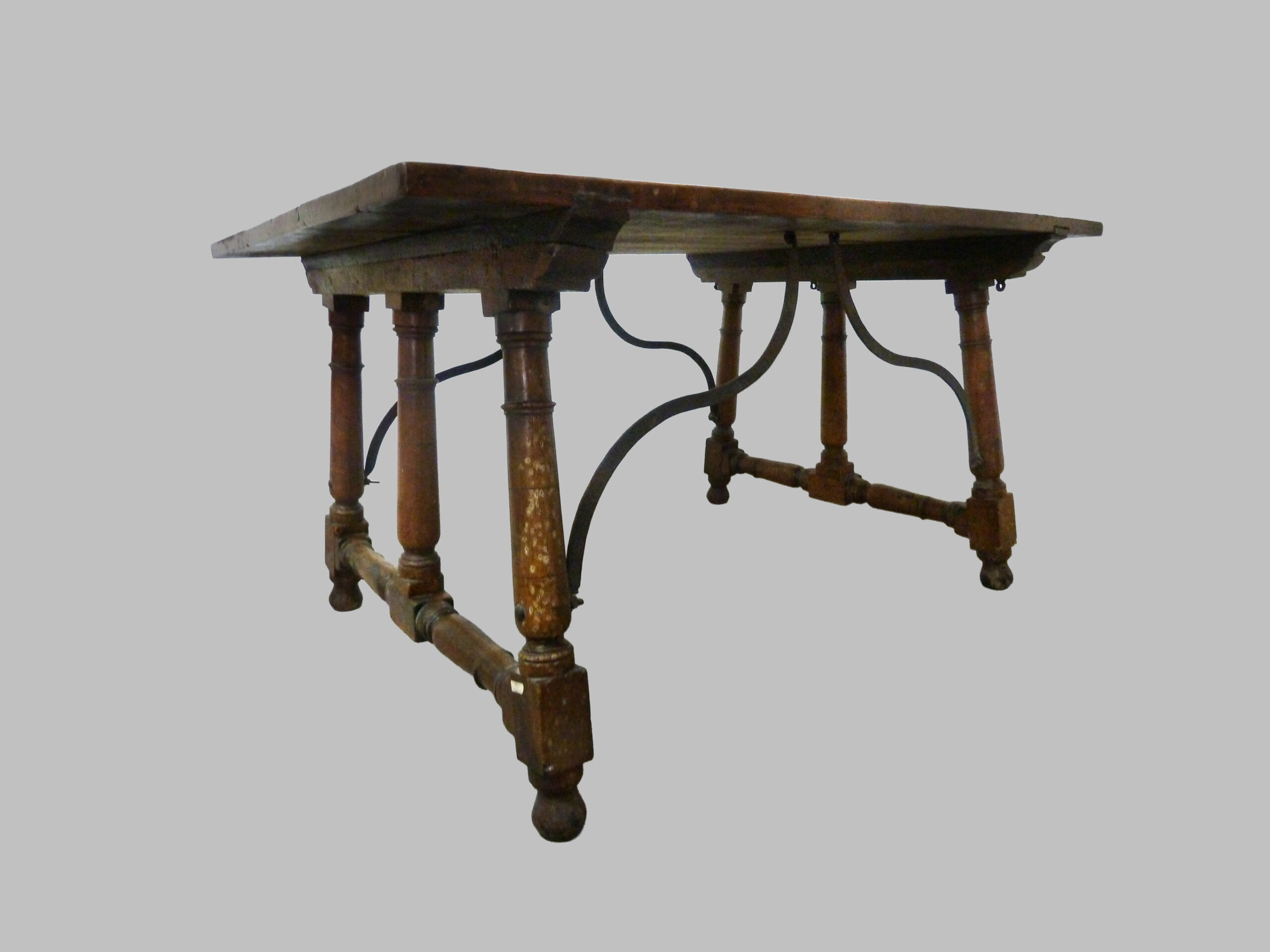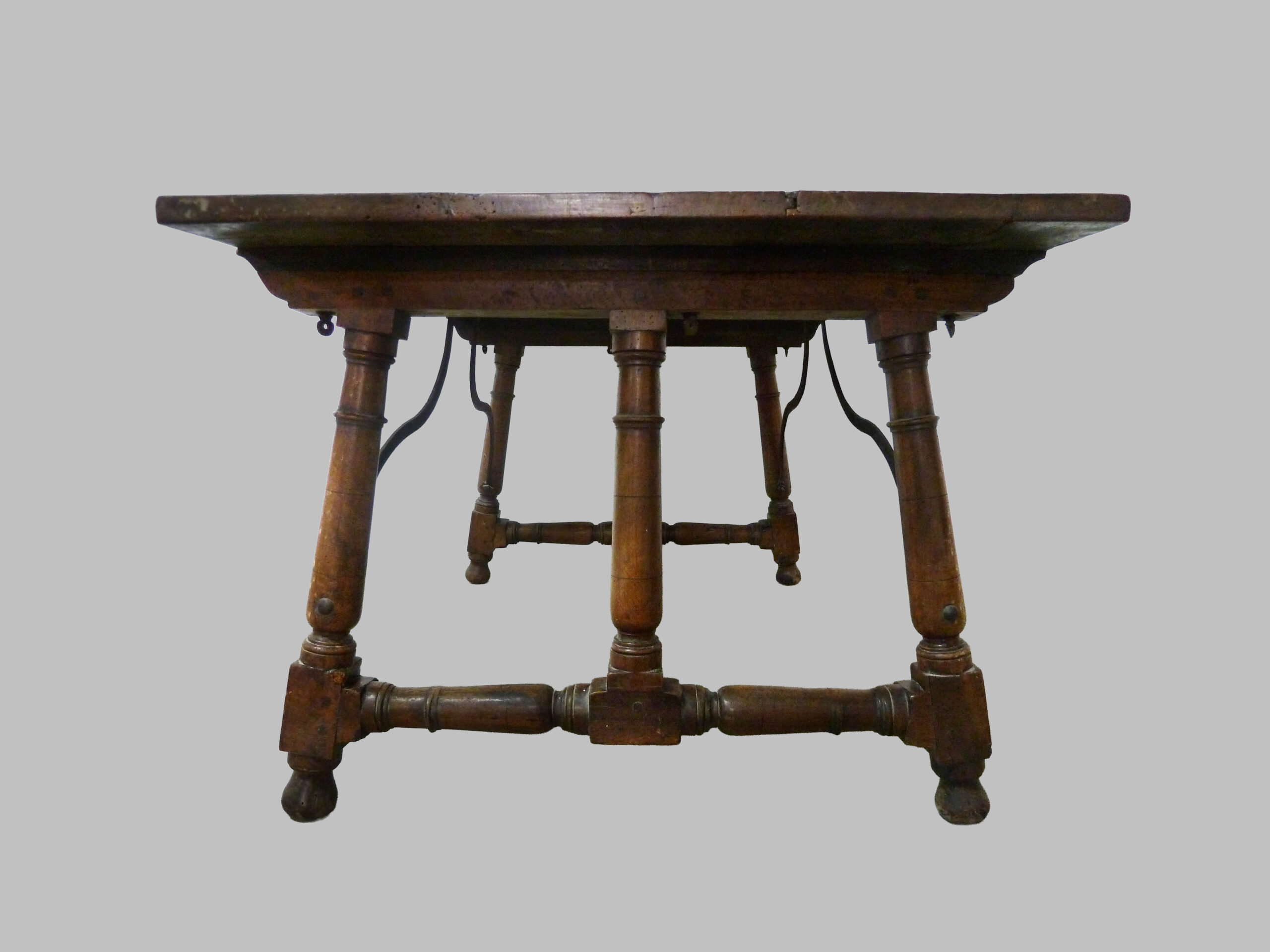 El mueble se distingue por sus seis patas torneadas, que aportan equilibrio y dinamismo, y por sus cuatro hierros frontales, elementos característicos que refuerzan la estructura y añaden un detalle decorativo auténtico propio de la época. La madera de nogal proporciona durabilidad, resistencia y una cálida tonalidad natural, resaltando la belleza y el carácter histórico de la pieza.