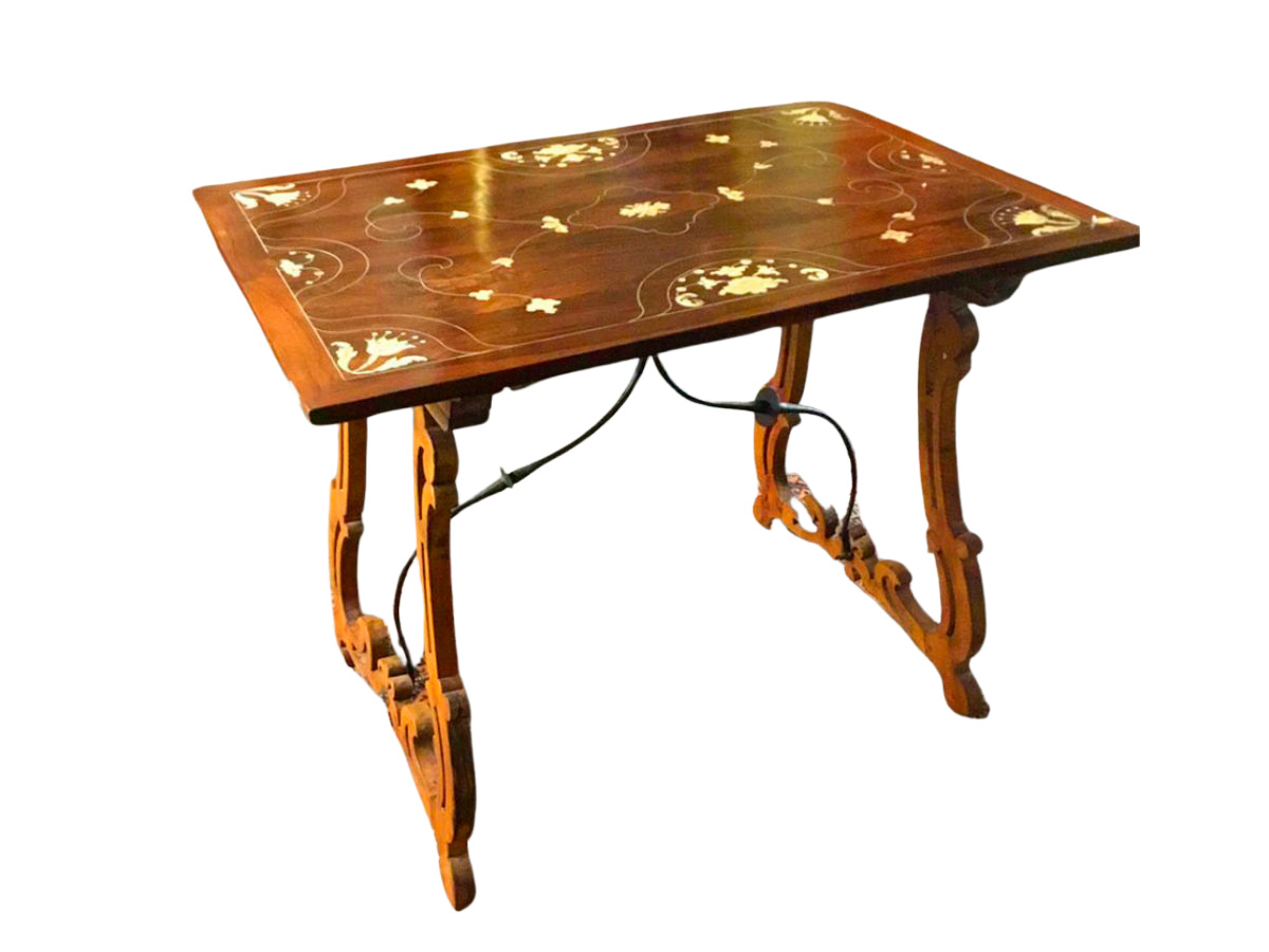 Bufete mallorquín ,sobre de nogal forrado de jacaranda y hueso. Pies de lira. Siglo XVIII.Dimensiones 68 x 99,5 cm. Altura 78 cm.
