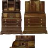 Buró librería Biedermeier de caoba, con tapa de cilíndro y en su interior hay cajoncitos en ambos lados y marquetería arquitectonica en el centro, en la parte superior consta de tres puertas con estantes y pequeños cajones y con tres cajones grandes en la parte inferior.