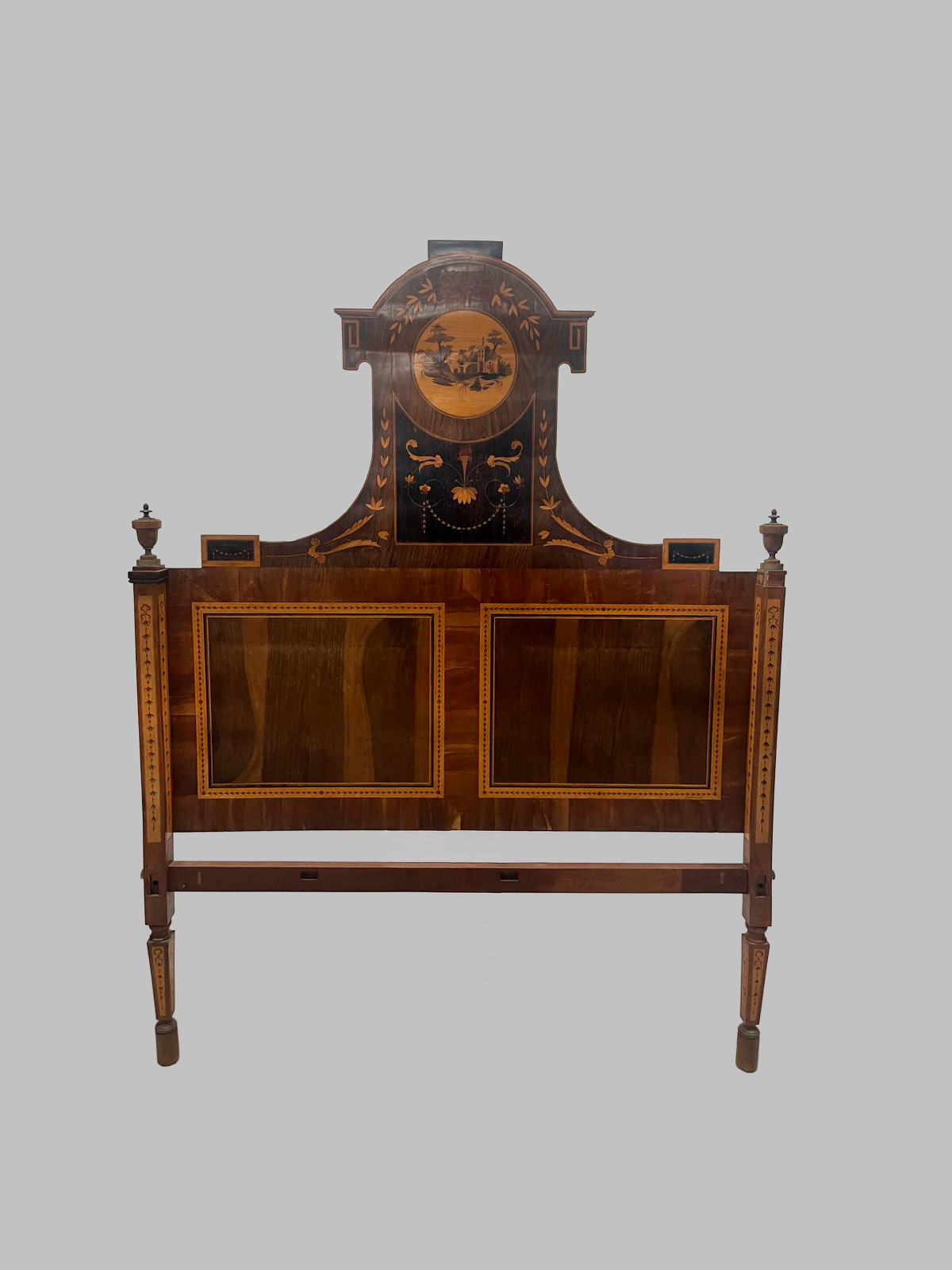 Cabezal de cama de estilo Carlos IV, realizado en nogal macizo, decorado con delicadas incrustaciones de limoncillo que representan un paisaje artístico, datado en el siglo XVIII.