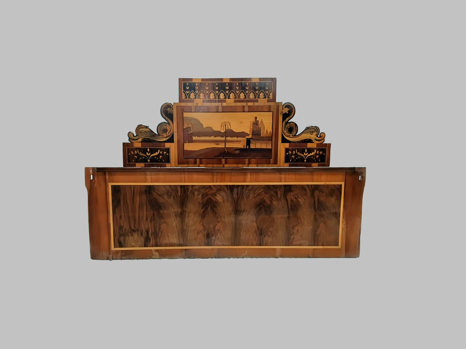 Cabezal de cama de estilo Carlos IV, realizado en nogal macizo y enriquecido con delicadas incrustaciones de limoncillo, formando un paisaje decorativo, datado en el siglo XVIII.