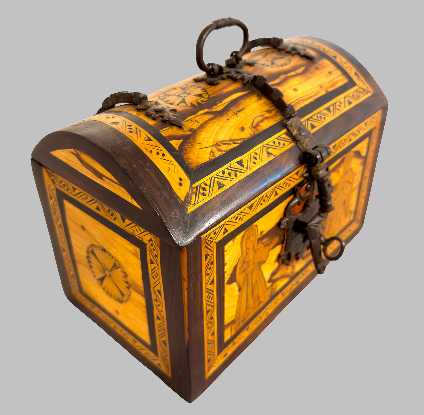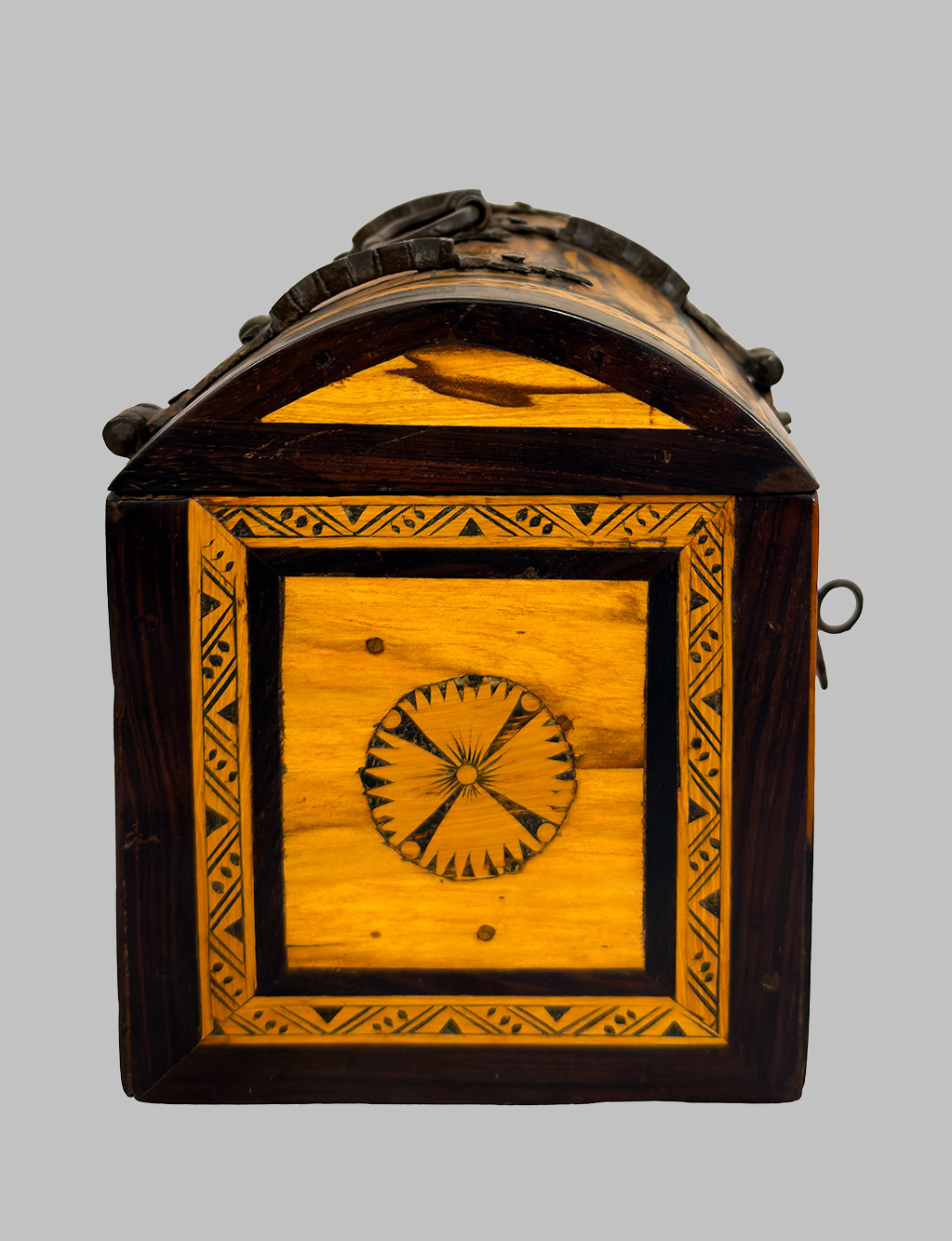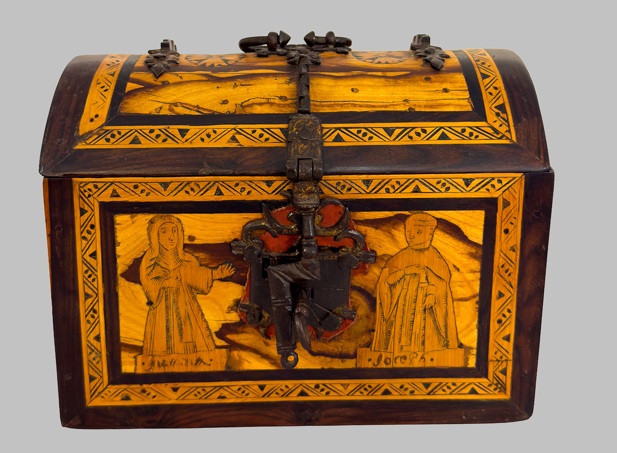 Cajita de tapa abombada con incrustacioines y herrajes hierro forjado. España . Siglo XVI. Arte Virreinal Oaxaqueño.