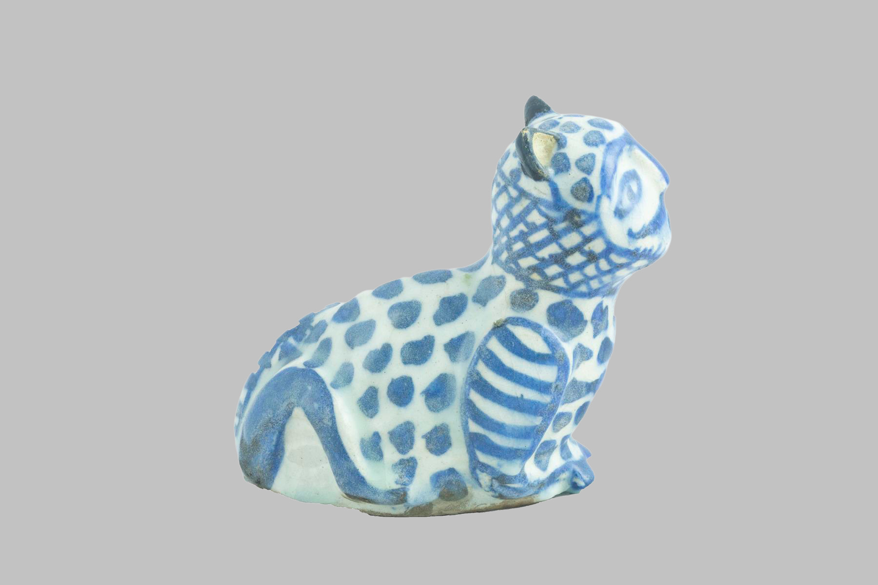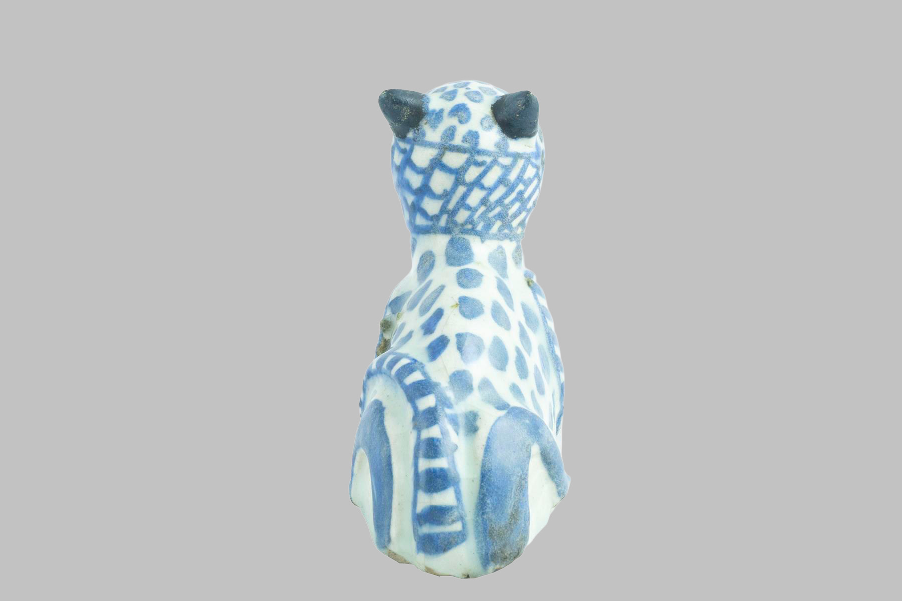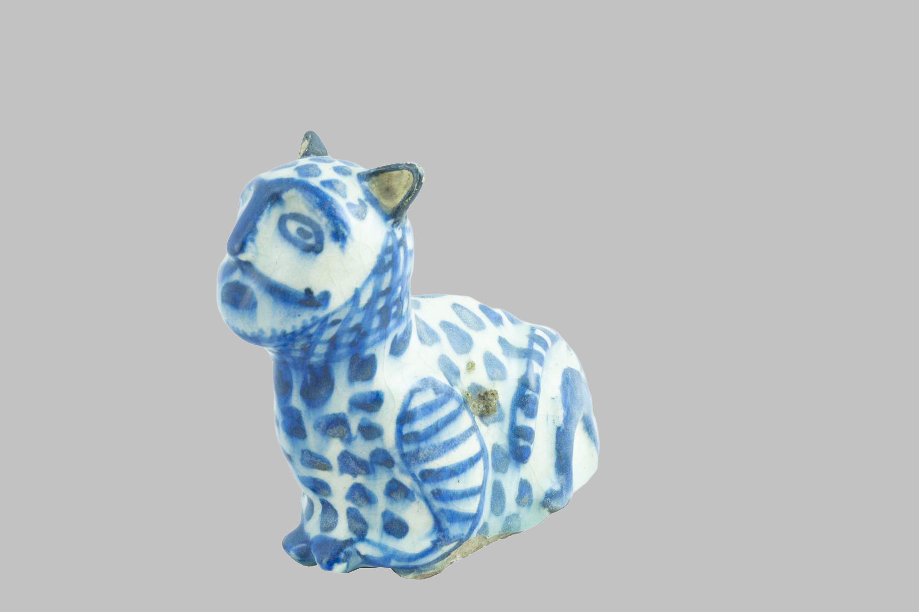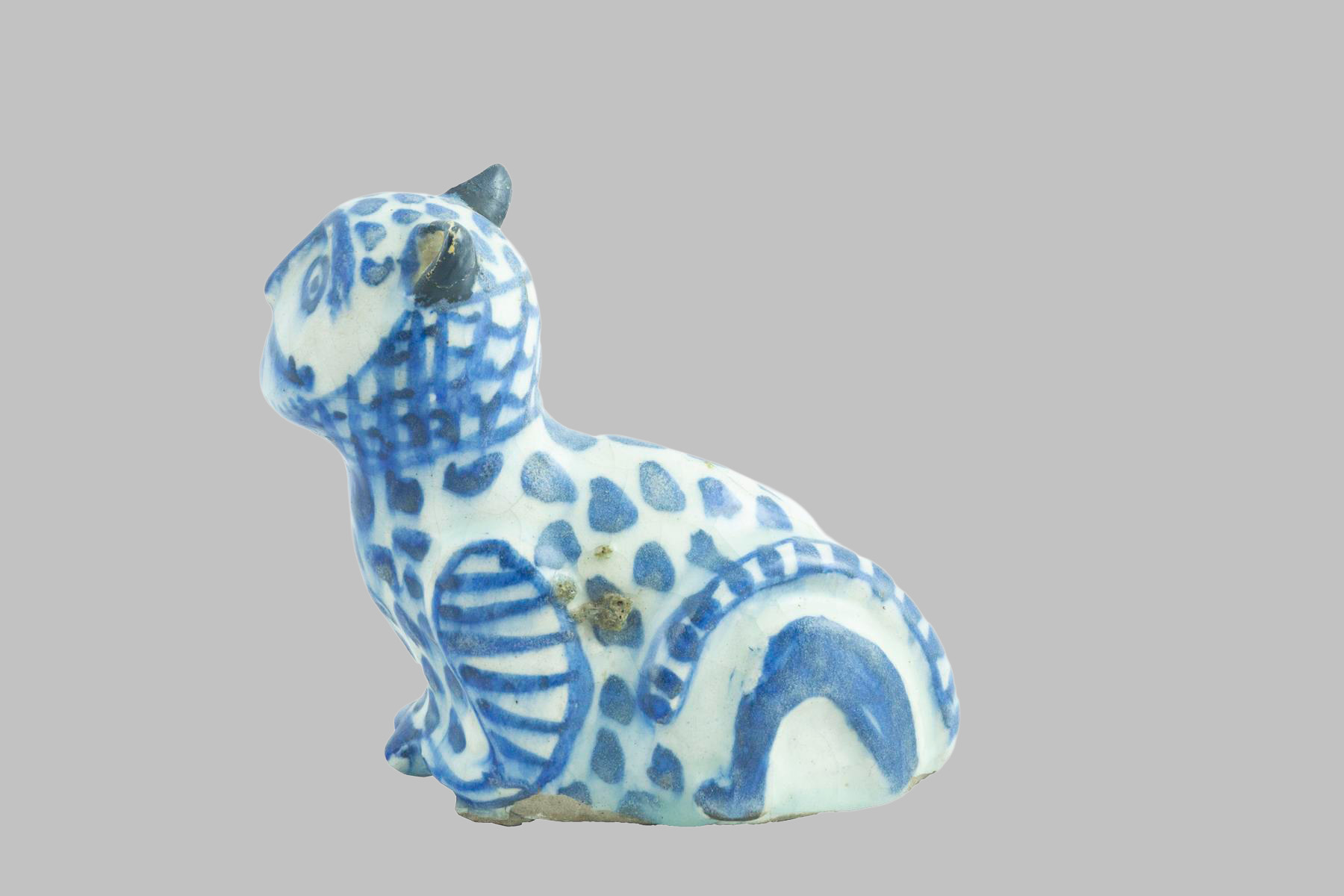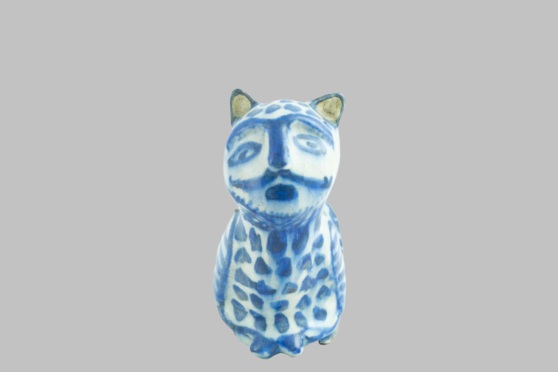 Figura de Cerámica blanca, pintada a mano en azul y representando un gato.