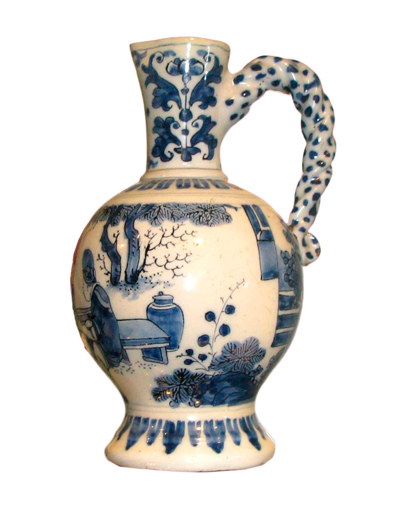 White and blue Canton porcelain pitcher with a braided handle and decorated with a traditional scene of oriental characters and different ornamental motifs in different areas of the pitcher.