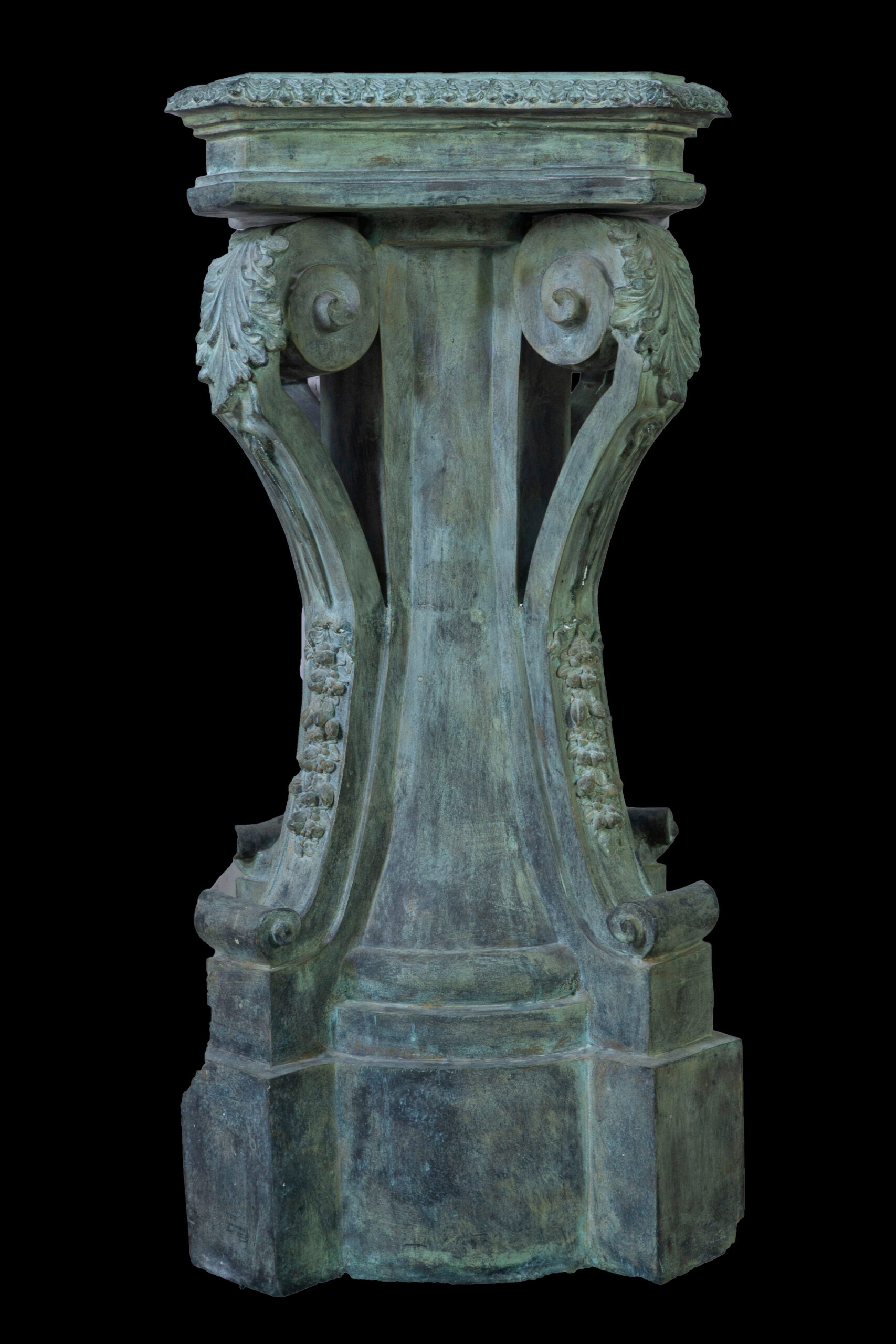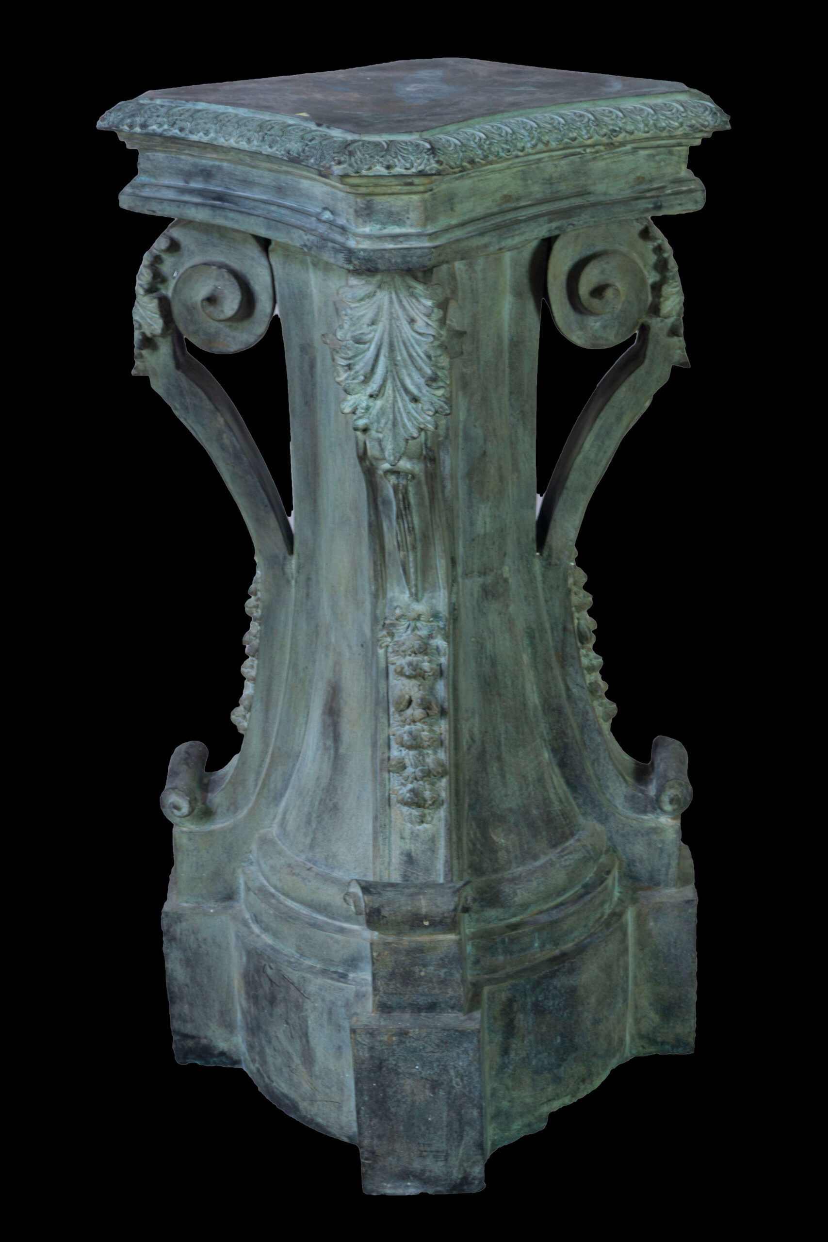 Columna Pedestal de Bronce, en tono verdoso y con cuatro adornos en forma de hoja en las esquinas.