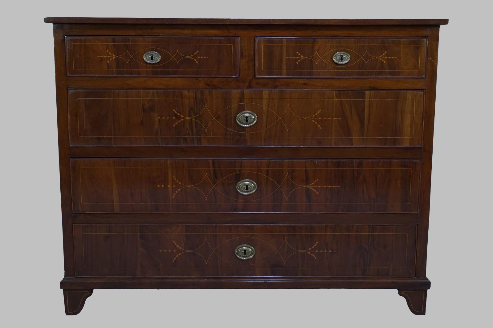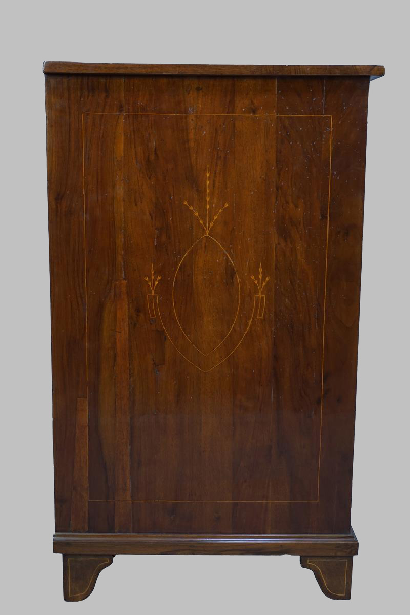 Cómoda Carlos IV de nogal con incrustaciones de limoncillo en el sobre, cajones y laterales, con tres cajones grandes y dos pequeños en parte superior.