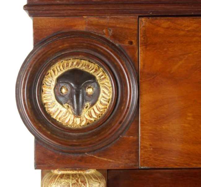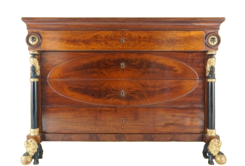 Cómoda de Adrià Ferran i Vallès (1774 – 1842) en madera de palma de caoba con cuatro cajones, con columnas negras a los lados en parte delantera, decorada con cariatides doradas y pies delanteros acabados en dos leones con cabeza dorada que sujetan bajo una pata una bola del mundo también dorada.
