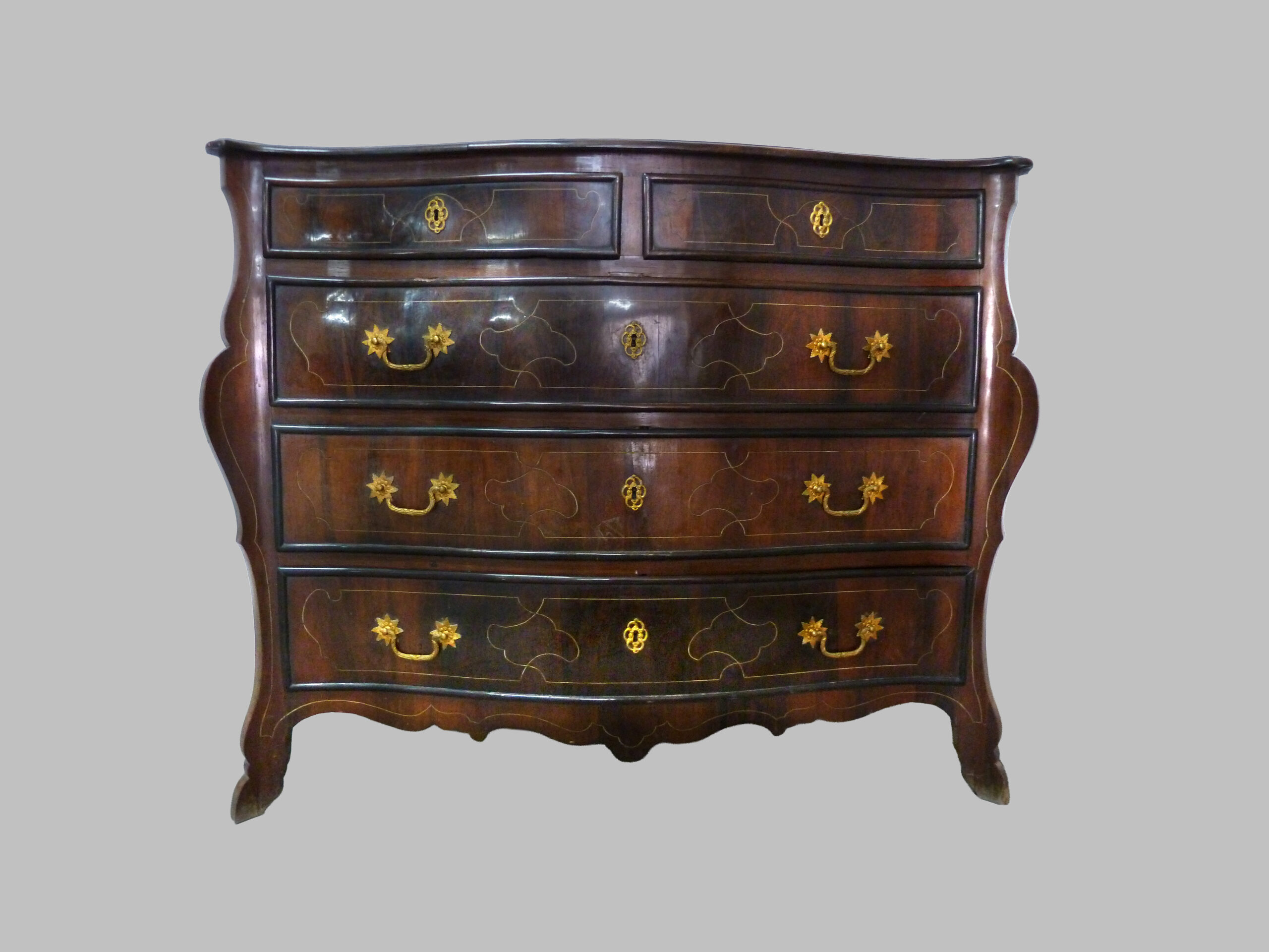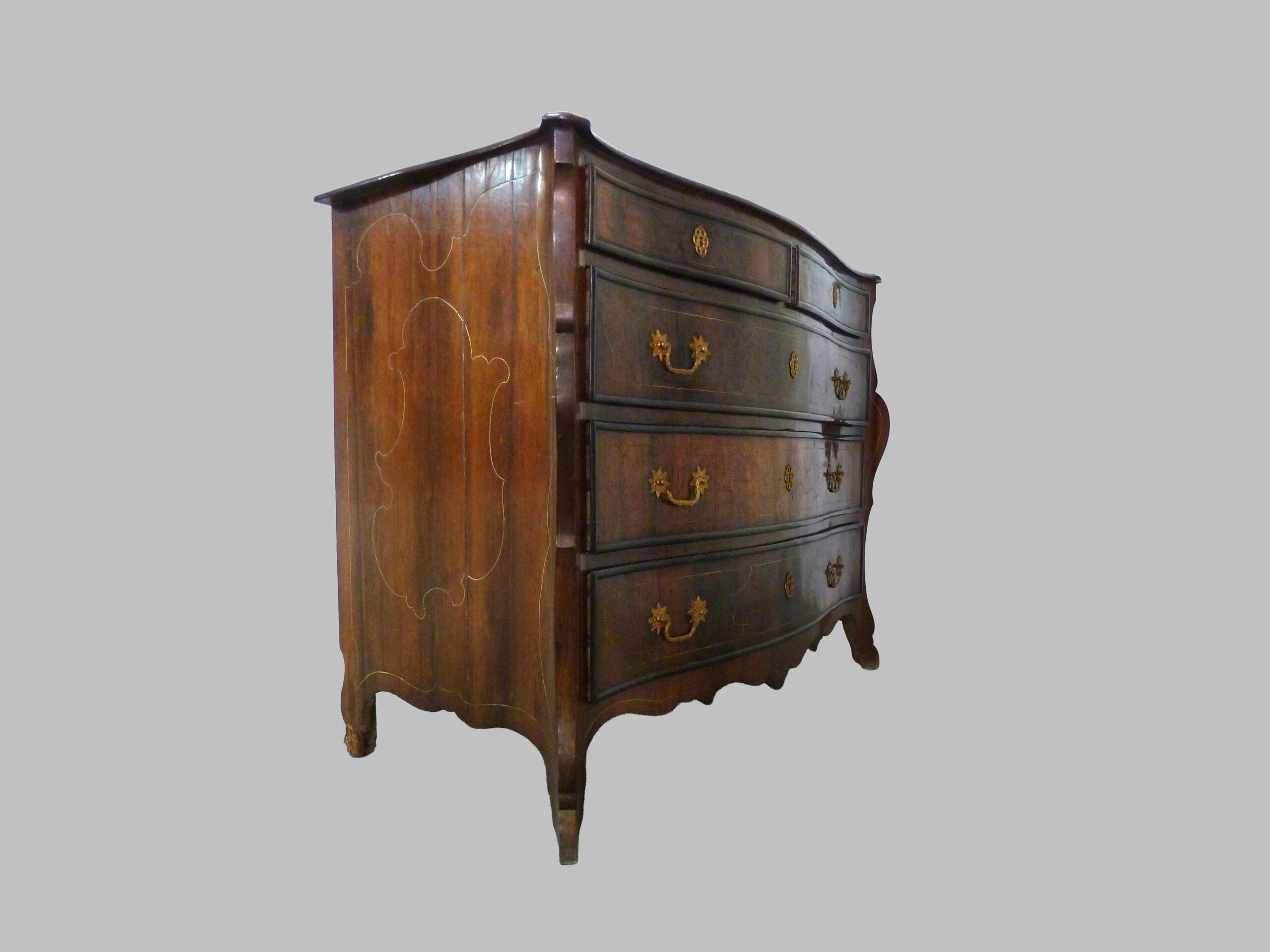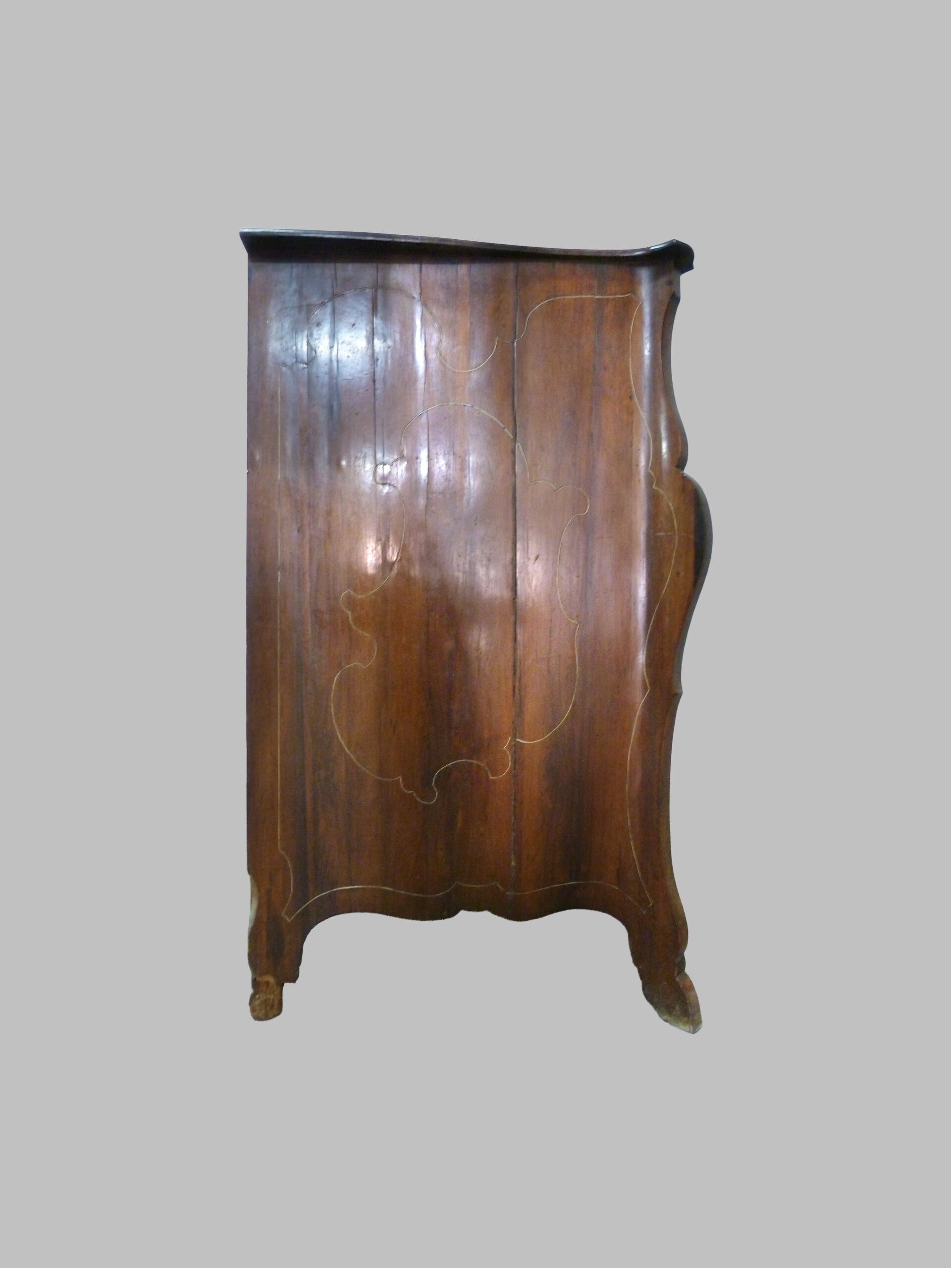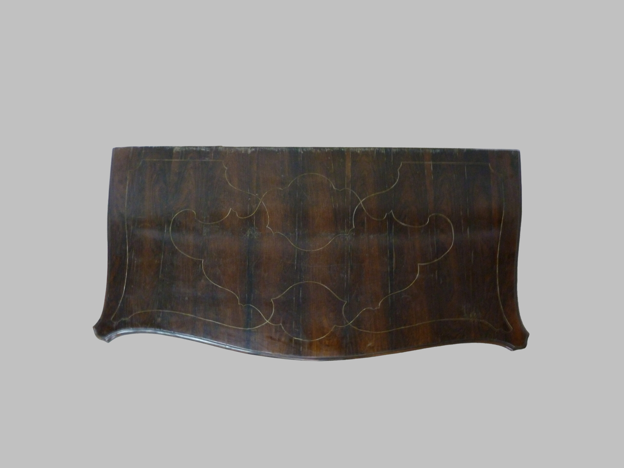 El mueble destaca por su frente abombado, que aporta dinamismo y elegancia, y por sus filetes de hueso incrustados, que crean un delicado contraste decorativo y realzan la sofisticación de la pieza. La jacaranda maciza ofrece durabilidad, estabilidad y una cálida tonalidad natural, típica de los muebles de alta ebanistería de la época.