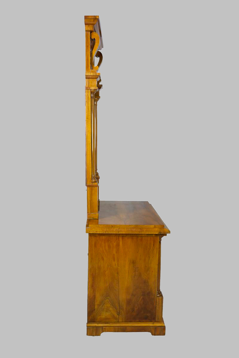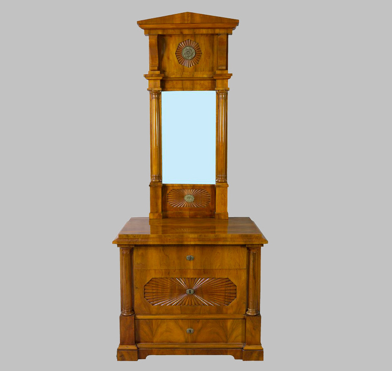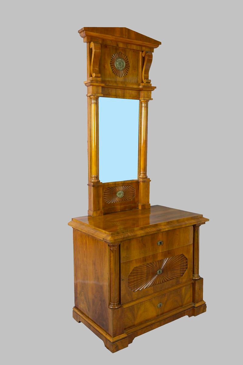 Dressing table with Biedermayer mirror in mahogany wood, with three drawers, two columns on the upper part and two on the lower part, three radial carvings (the two upper ones with a golden medallion in the central part) and a triangular-shaped top finish.