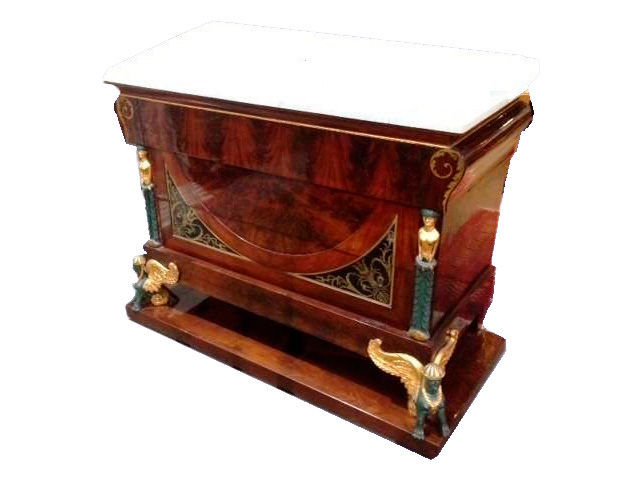 Cómoda Imperio de Adrià Ferran i Vallès (1774 – 1842), en madera de palma de caoba con tres cajones, sobre de mármol blanco e incrustaciones de latón, con los pies traseros rectos y los delanteros en forma de figuras aladas que la sujetan a una plataforma.
