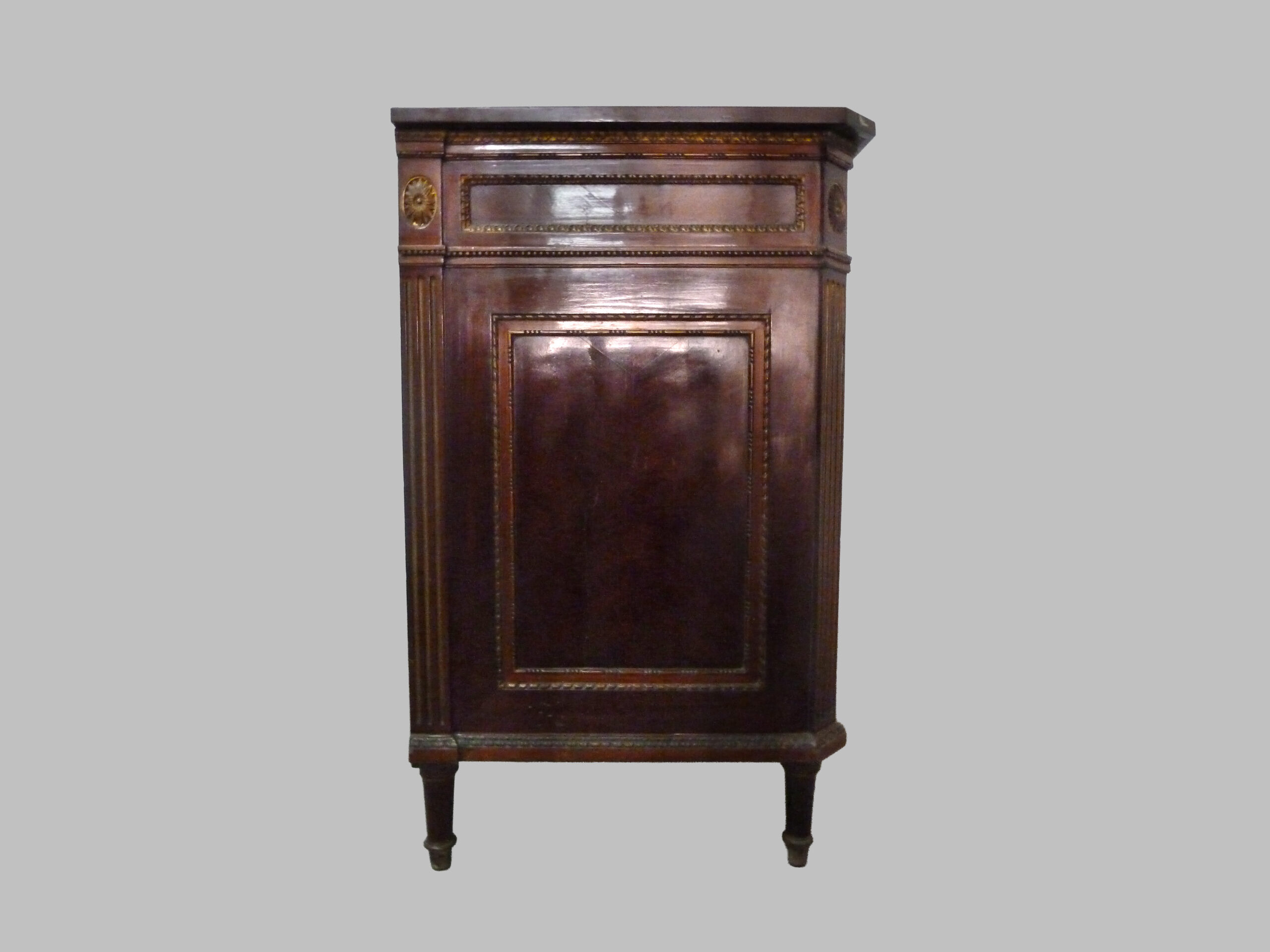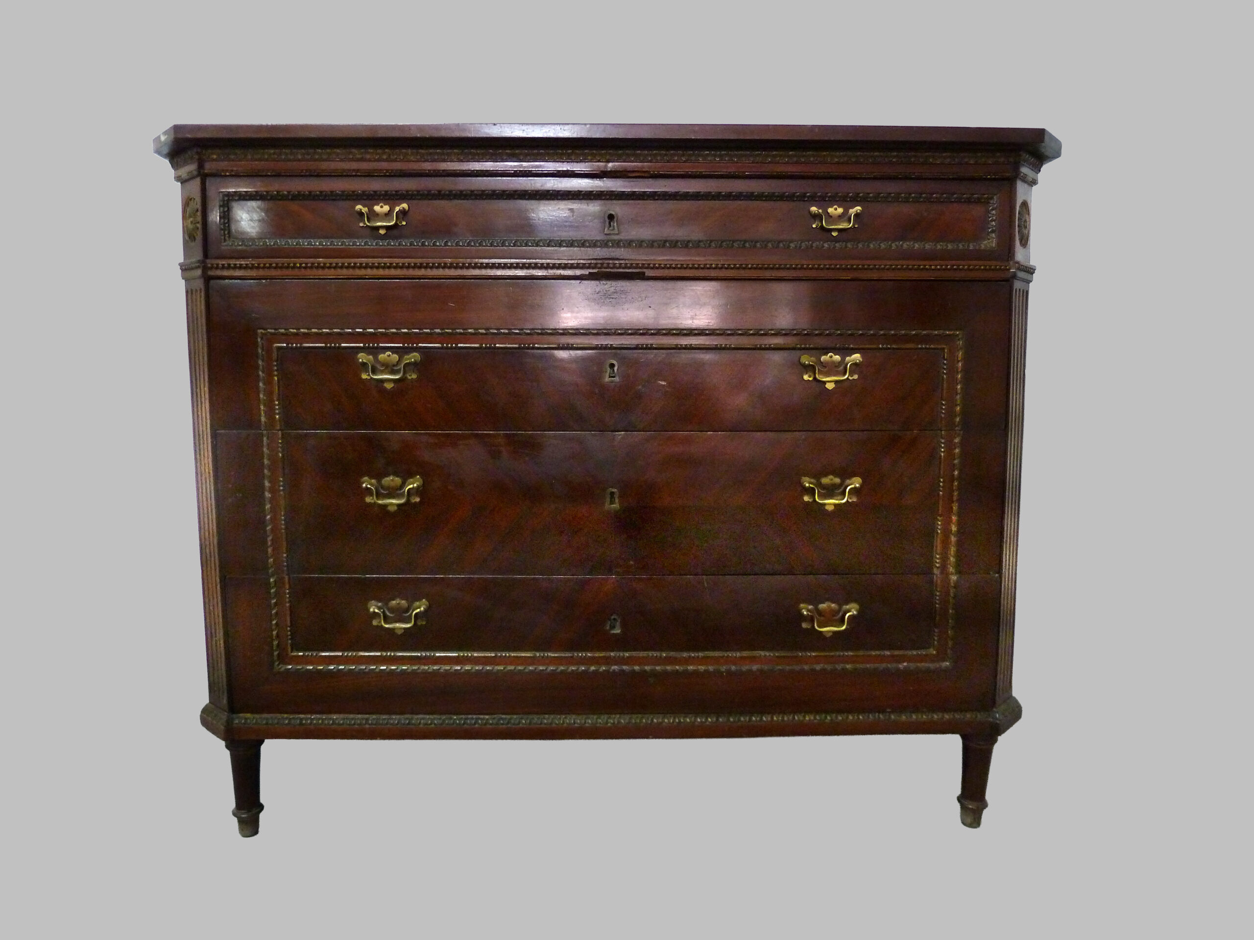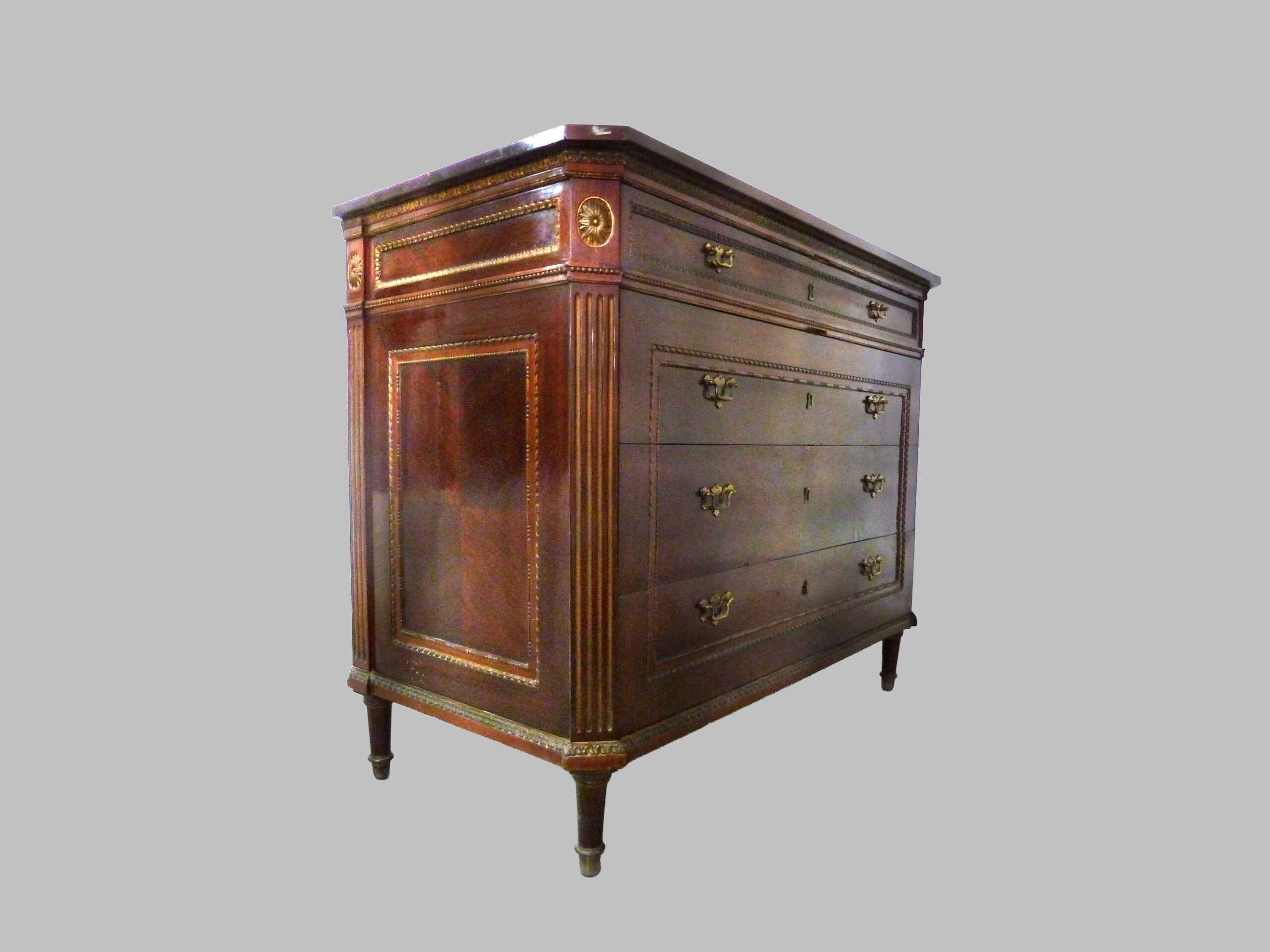Cómoda de estilo Luis XVI realizada en nogal macizo, datada alrededor de 1780 en Francia, una pieza que refleja la sofisticación y el refinamiento del mobiliario europeo de finales del siglo XVIII.