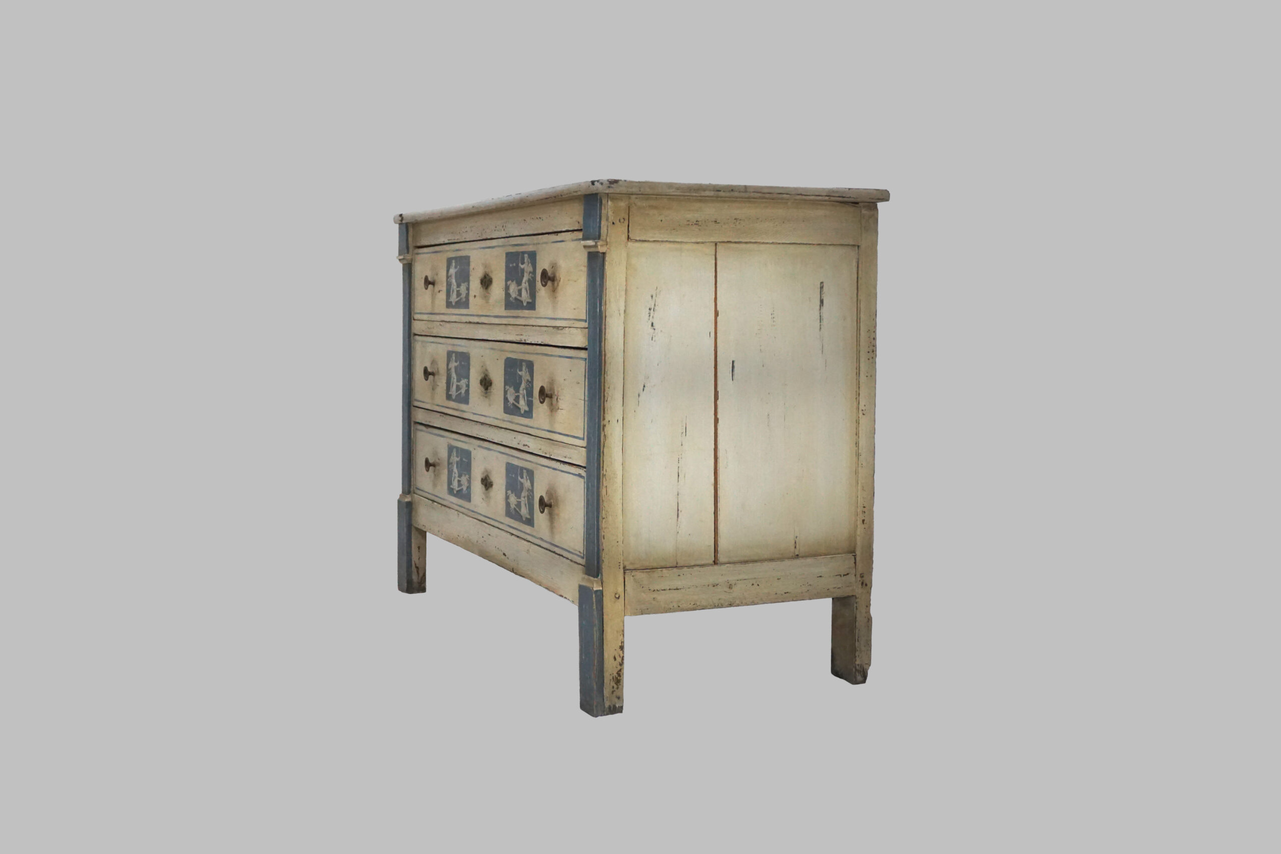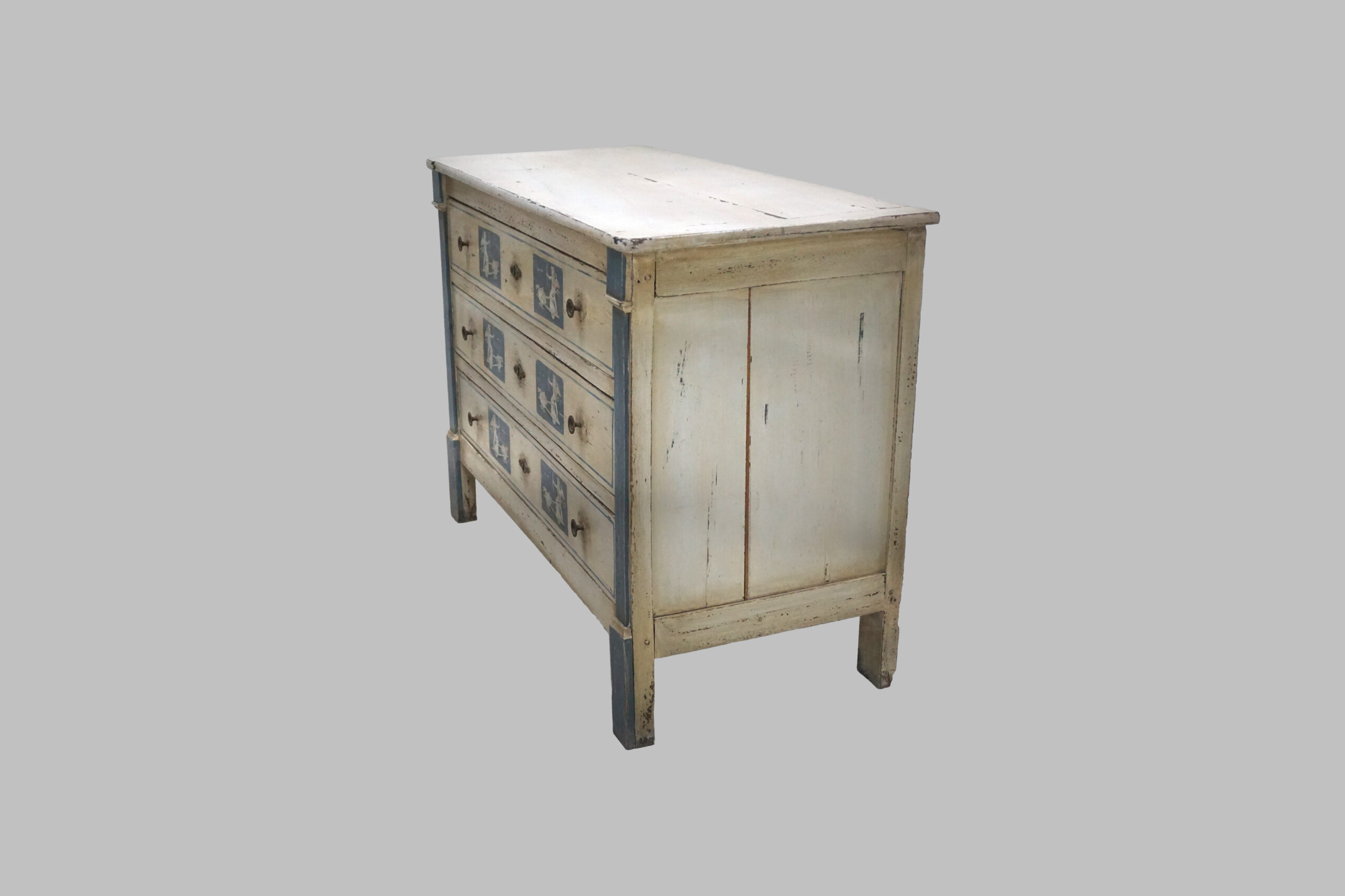 La pieza presenta una estructura de líneas rectas y proporciones equilibradas, características del estilo Luis XVI, combinadas con una exquisita decoración en azul con escena de arquero, que aporta singularidad, valor artístico y un aire decorativo muy especial. El acabado lacado en blanco realza la luminosidad del mueble y resalta los detalles pictóricos.