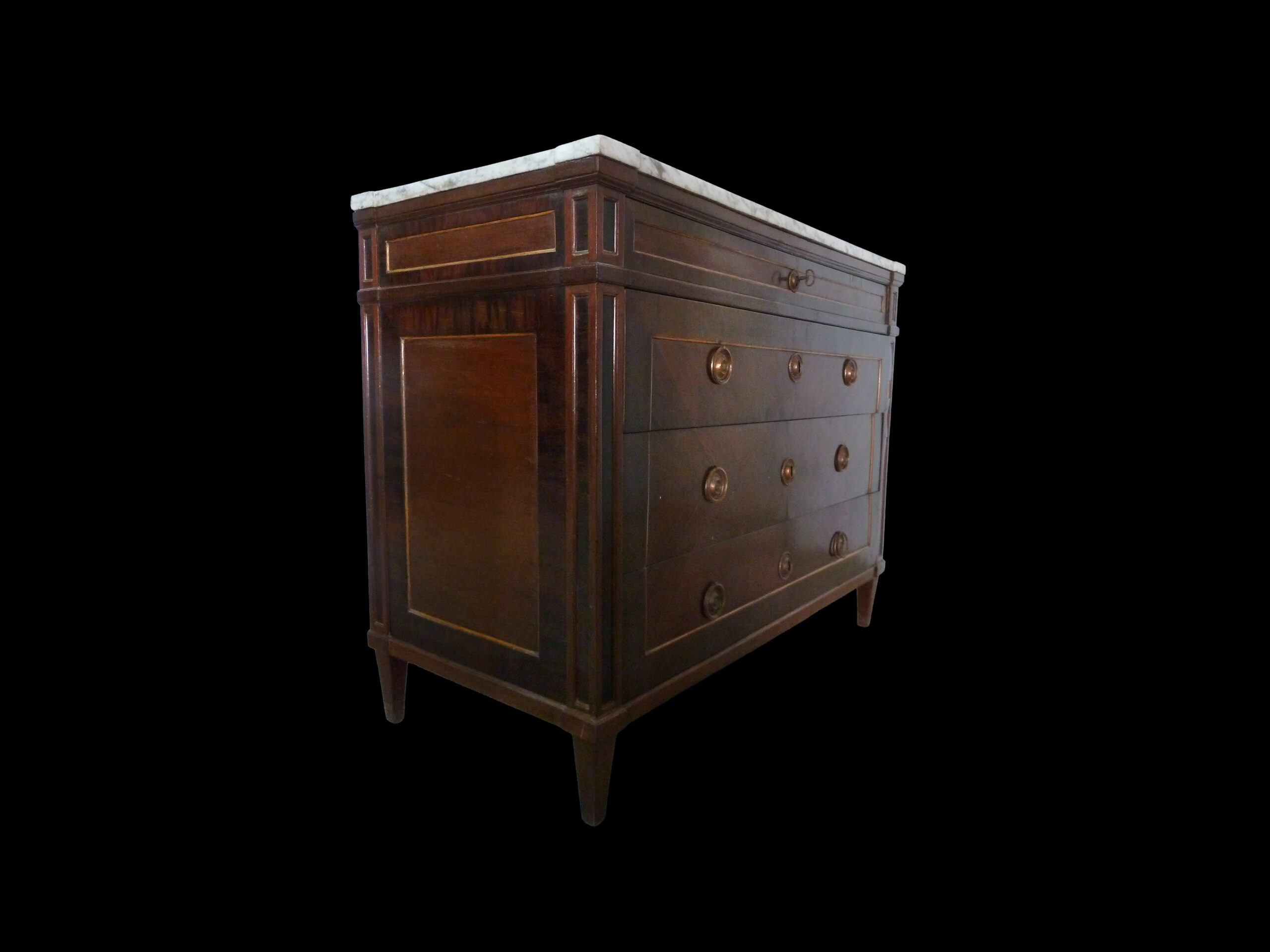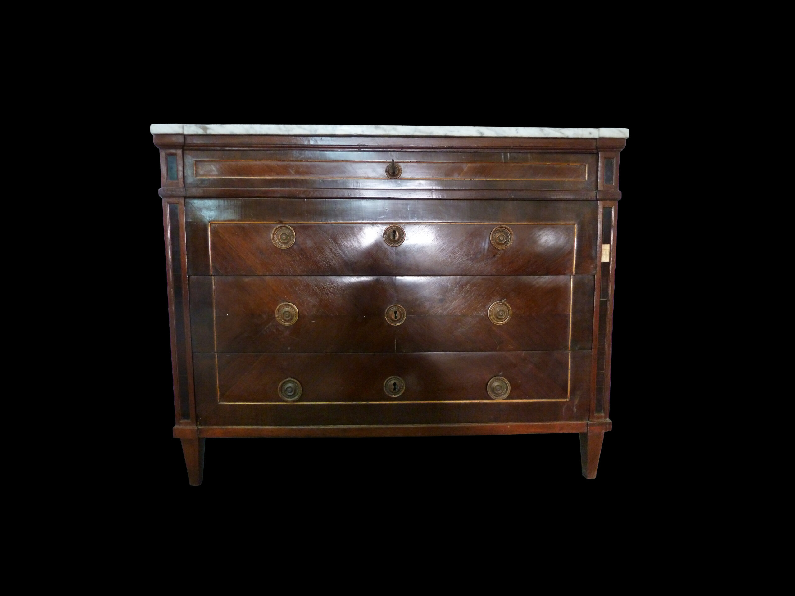 Cómoda de estilo Luis XVI, de origen menorquín durante el reinado de Carlos III, una pieza de mobiliario que combina funcionalidad, sofisticación y la maestría artesanal de la ebanistería española del siglo XVIII.