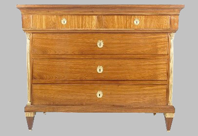Cómoda Imperio Menorquína de caoba rubia, con tres cajones grandes y dos pequeños en parte superior, una fina columna estriada y dorada a cada lado, herrajes dorados y cuatro pies en disminución.