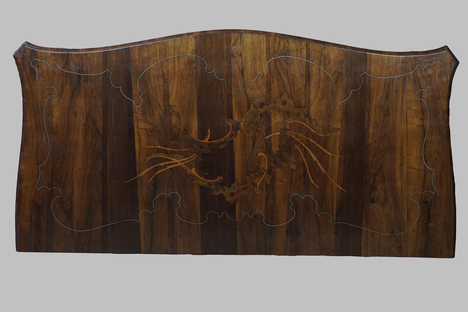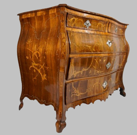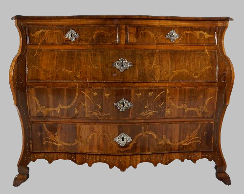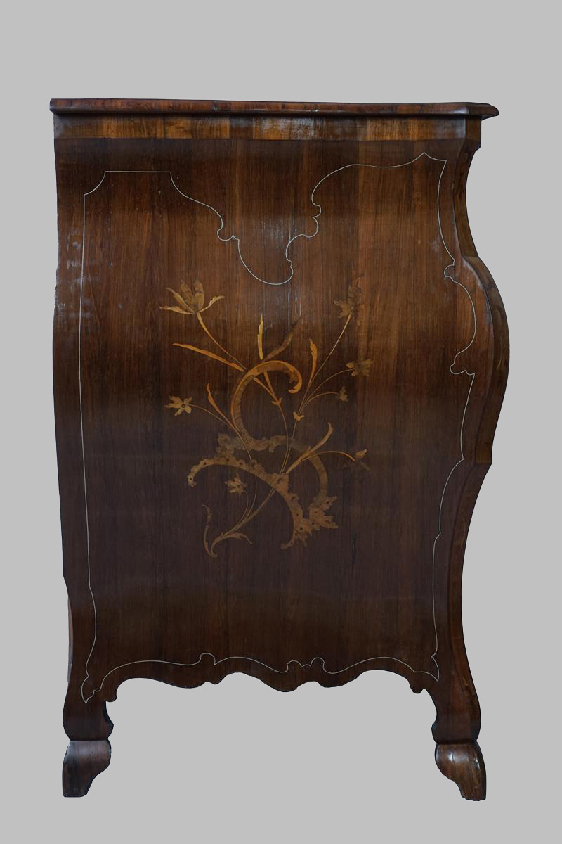 Cómoda panzuda en madera de jacarandá, con incrustaciones de hueso y limoncillo en frontal, laterales y sobre, cinco cajones (tres grandes y dos pequeños en parte superior) con boquillas de plata, patas de cabra y bajo frontal con faldón.