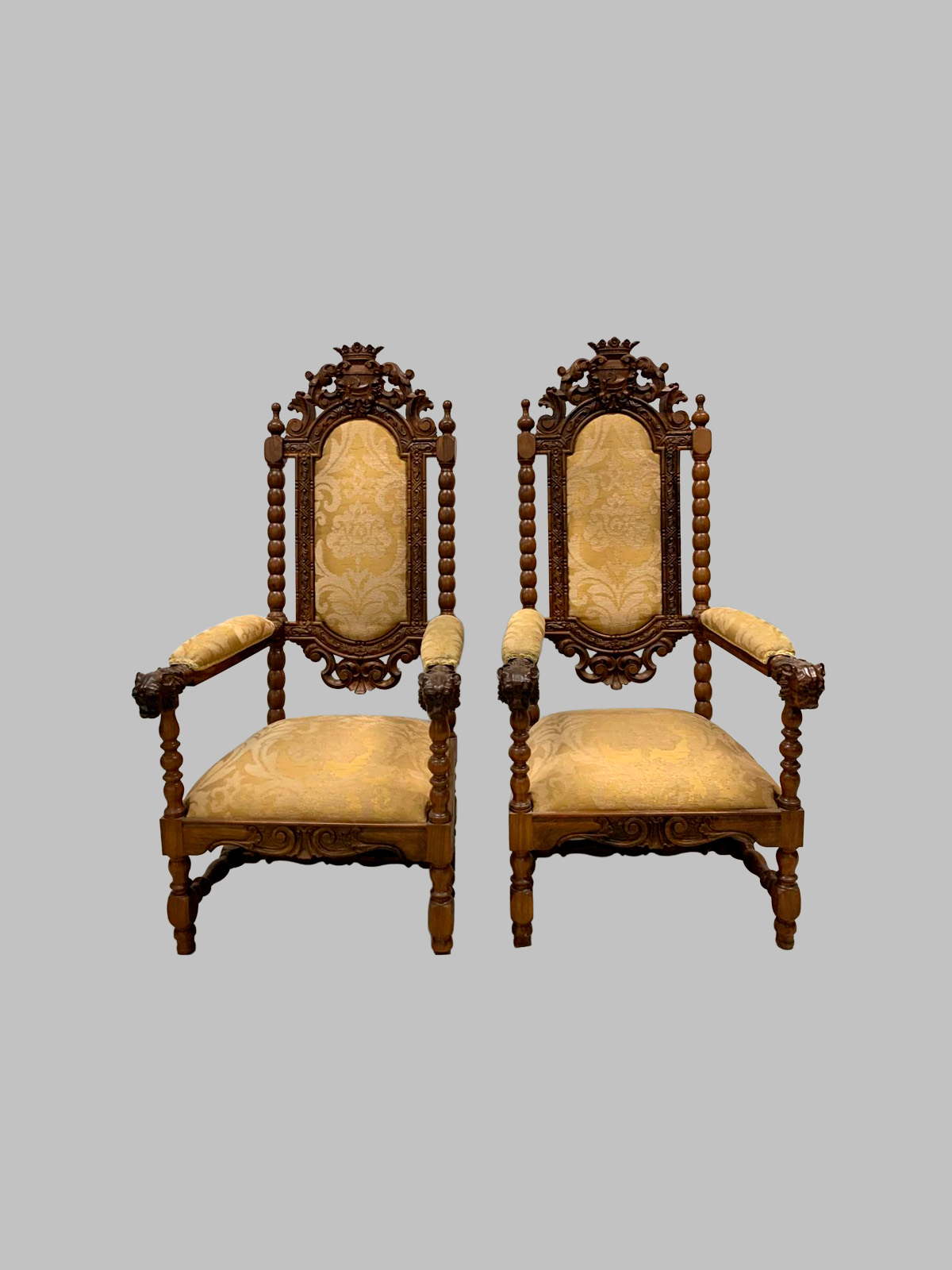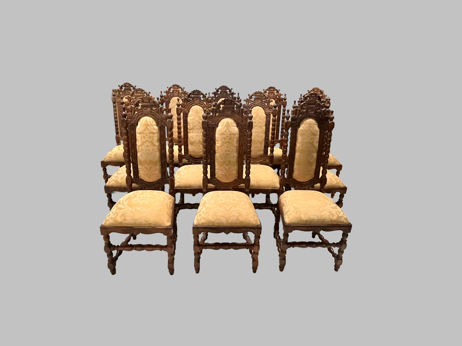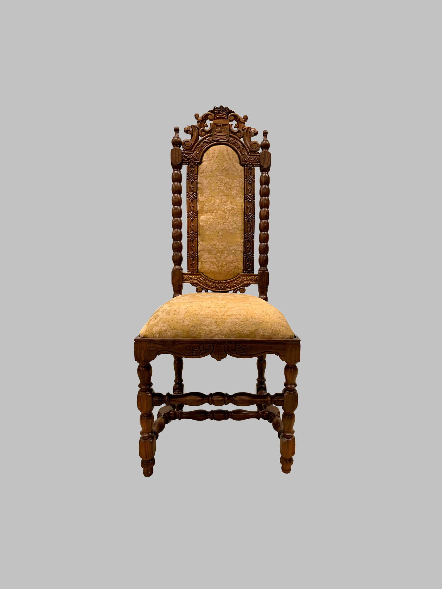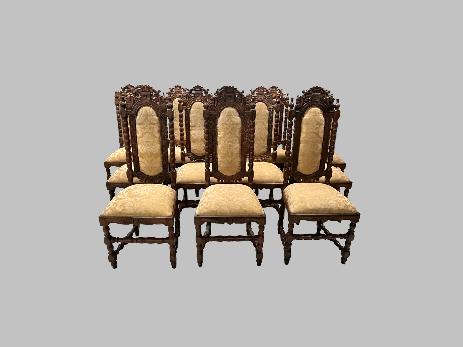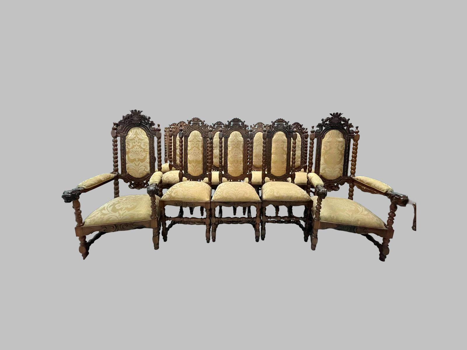 Conjunto compuesto por 12 sillas y 2 sillones, realizado en nogal macizo y trabajado artesanalmente con torneado a mano, que destaca por su uniformidad, solidez y gran presencia decorativa.