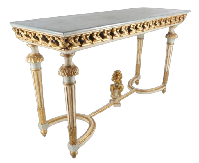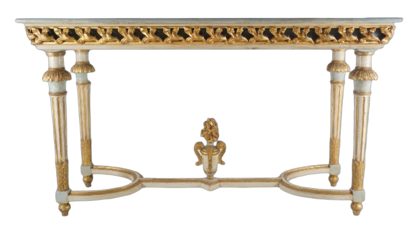 Louis XVI Console in tones of white, gray and gold with fine gold, with four ribbed legs with a floret-type decoration on the top of each one, a base with a horseshoe-shaped finish on each side that joins the legs and in center of the same ornament in the form of a small vase with golden flowers.