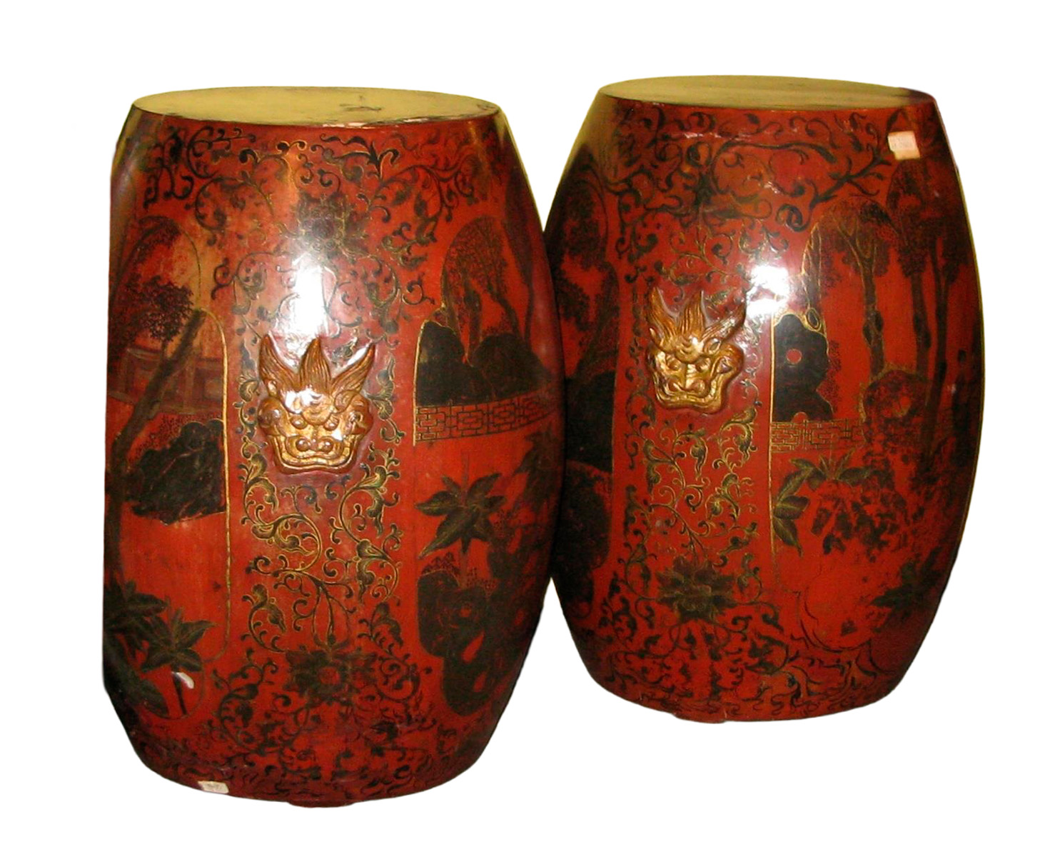 Pair of Chinese hand-lacquered stools in gold, red and green, drum-shaped, with floral decoration and lightly embossed golden masks.