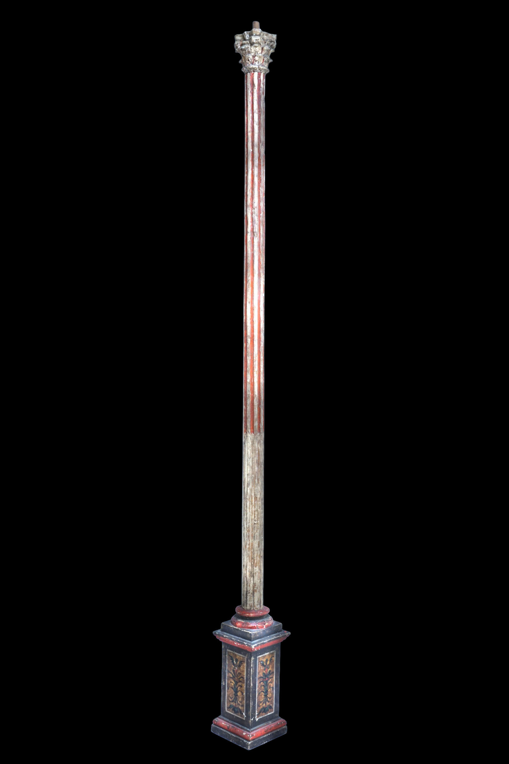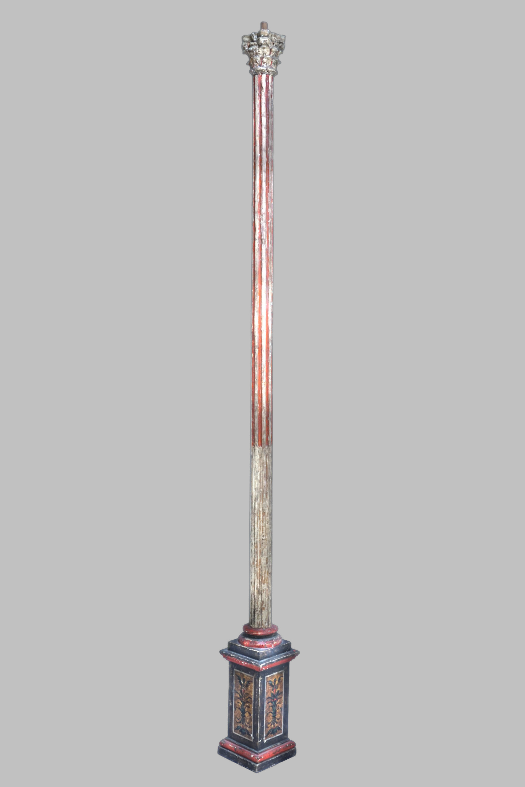 Imponente conjunto de cuatro columnas de madera tallada y policromada, de gran elegancia y valor histórico. Cada columna presenta base cuadrada decorada con flores pintadas a mano y un fuste estriado en tono rojo intenso, que resalta la riqueza cromática y artesanal de la época barroca italiana.
