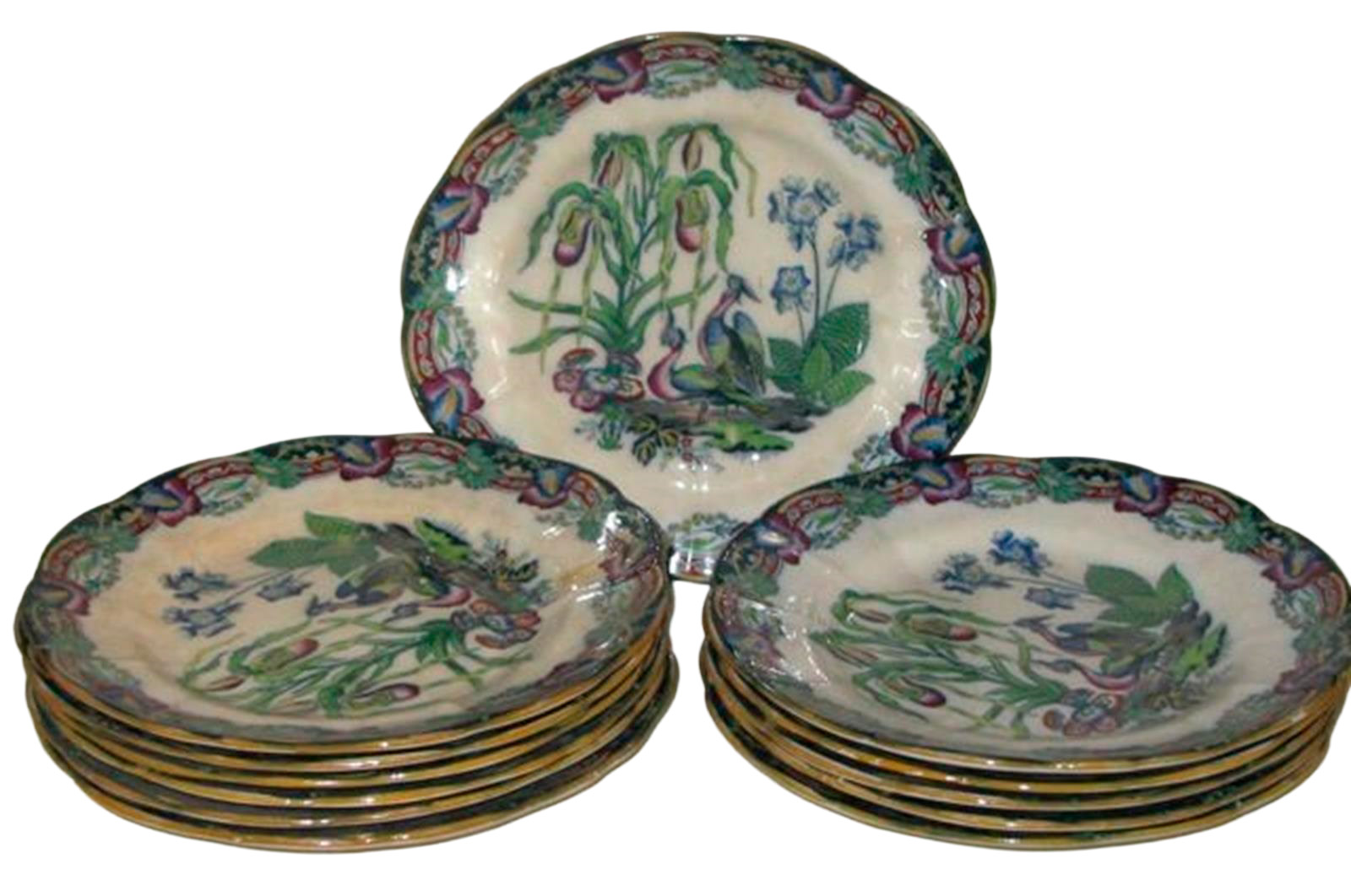 Doce platos policromados de porcelana inglesa «Mason», decorados en el centro con pavos reales y flores y cenefa floral en todo el borde del plato.