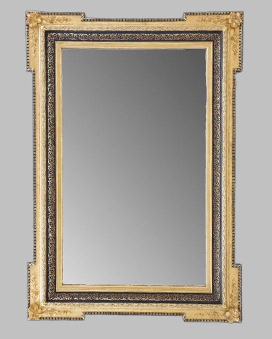 Espejo Isabelino de talla dorada con oro fino y laca negra, con adorno floral en las esquinas.