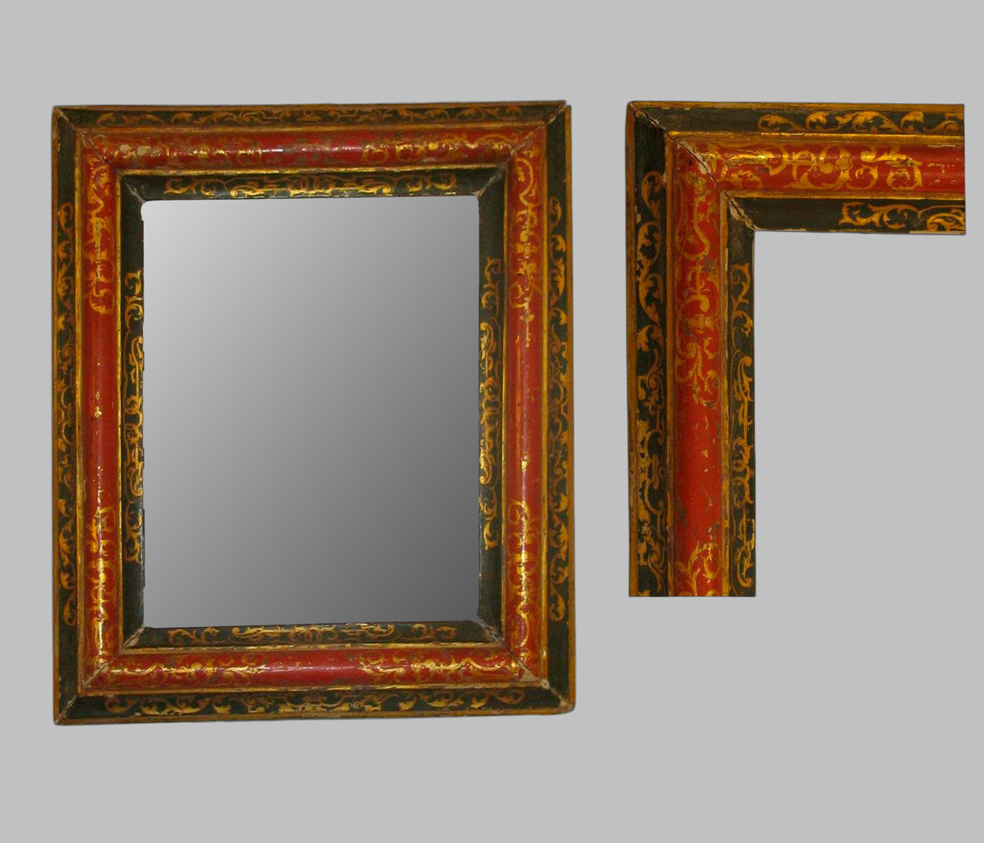 Espejo con marco policromado en rojo, verde y decorado con motivos en dorado.
