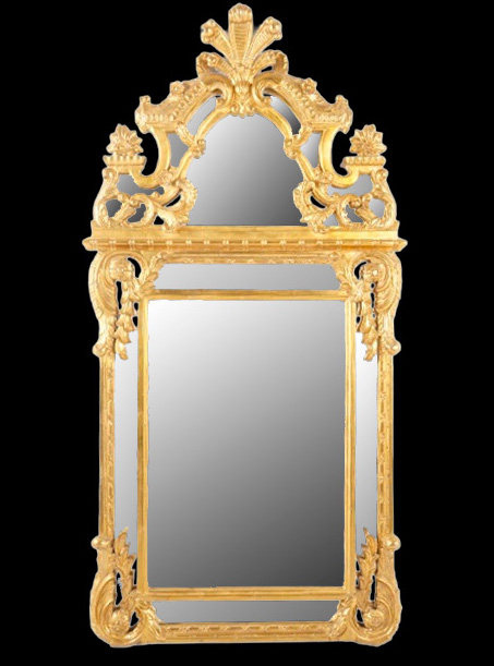 Espejo estilo Barroco de talla y dorado con oro fino, con copete en parte superior estilo penacho de cinco puntas, espejos laterales biselados y espejo también en parte superior.