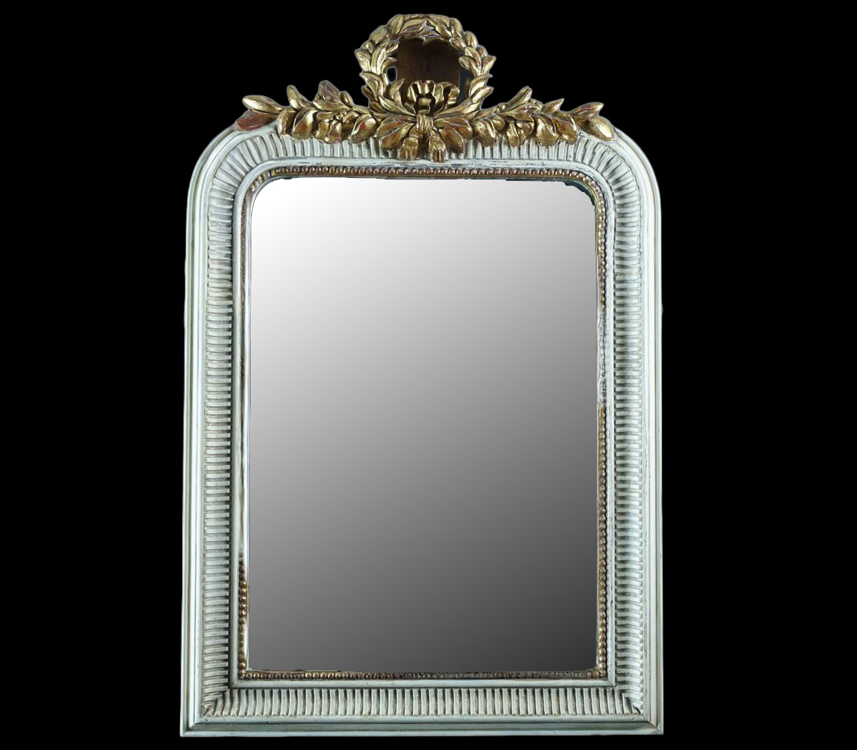 Espejo estilo Imperio lacado en blanco con bolitas doradas en parte interior del marco, con copete también dorado y tallado en forma de hojas en parte superior.