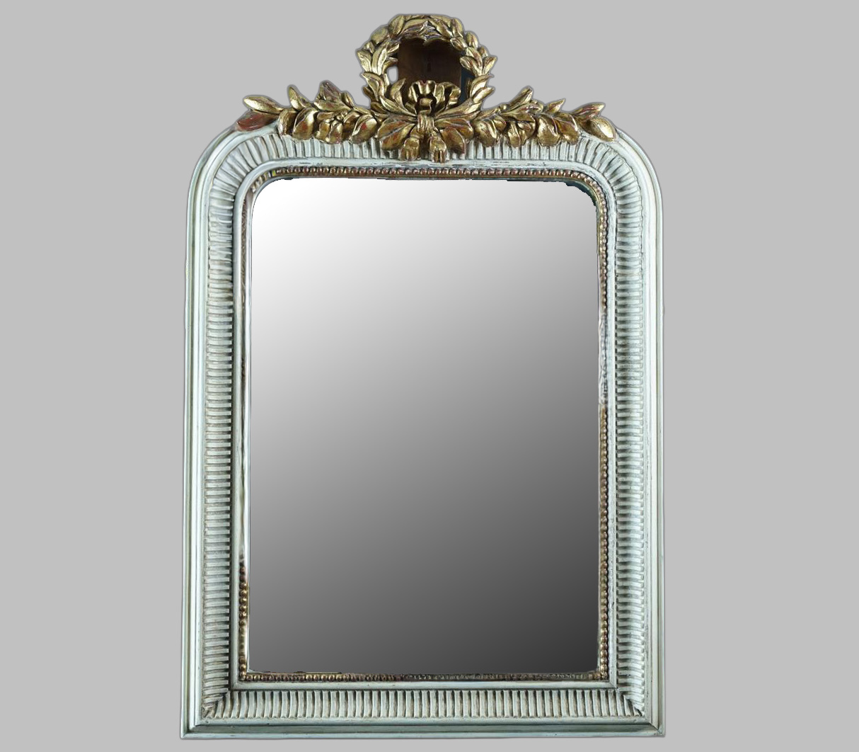 Espejo estilo Imperio lacado en blanco con bolitas doradas en parte interior del marco, con copete también dorado y tallado en forma de hojas en parte superior.