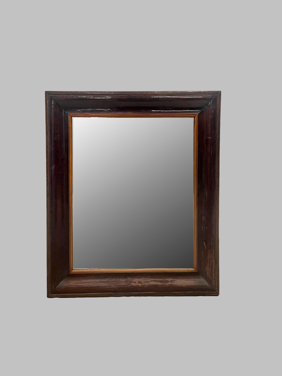 Espejo de estilo isabelino, realizado en caoba maciza, que destaca por su refinado marco abombado decorado con marquetería de limoncillo, aportando contraste, calidez y riqueza ornamental.