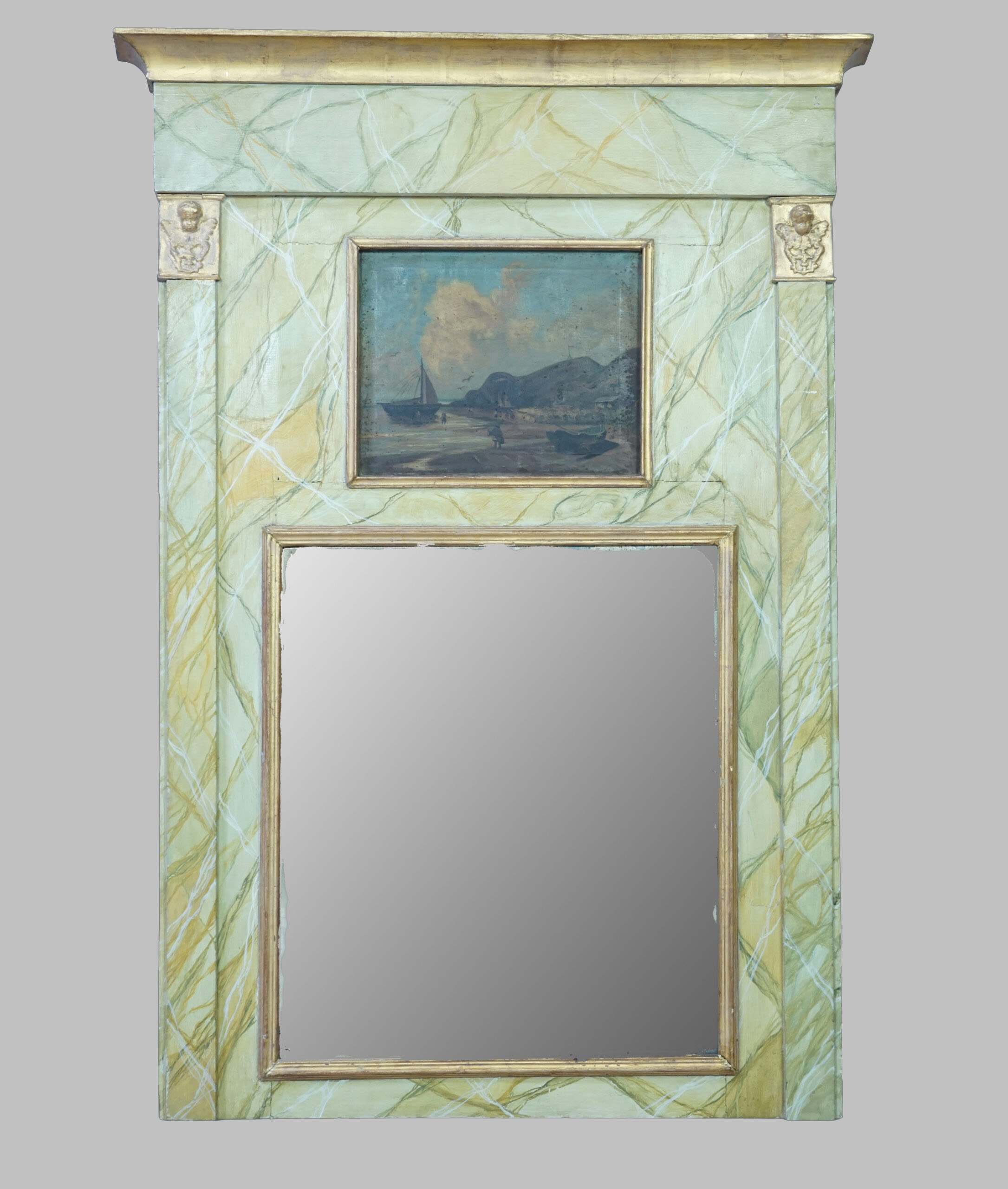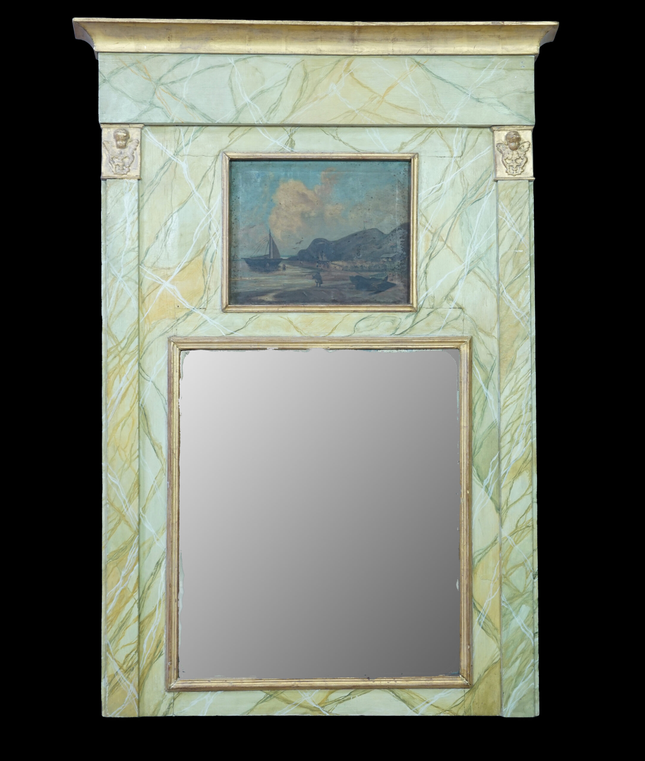 Trumeau mirror, with the mirror framed in gold at the bottom, decorated at the top with a painting of a seascape, also with a gold frame and the rest marbled with a gold upper finish and a little golden angel on each side.
