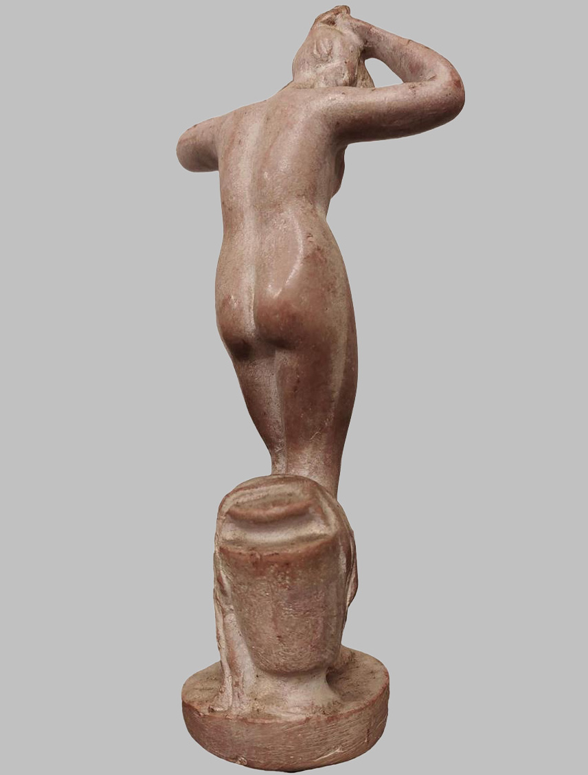 Figura francesa de Terracota: Mujer desnuda de pie sobre una base redonda, con un cubo detrás de ella y acicalandose el pelo.