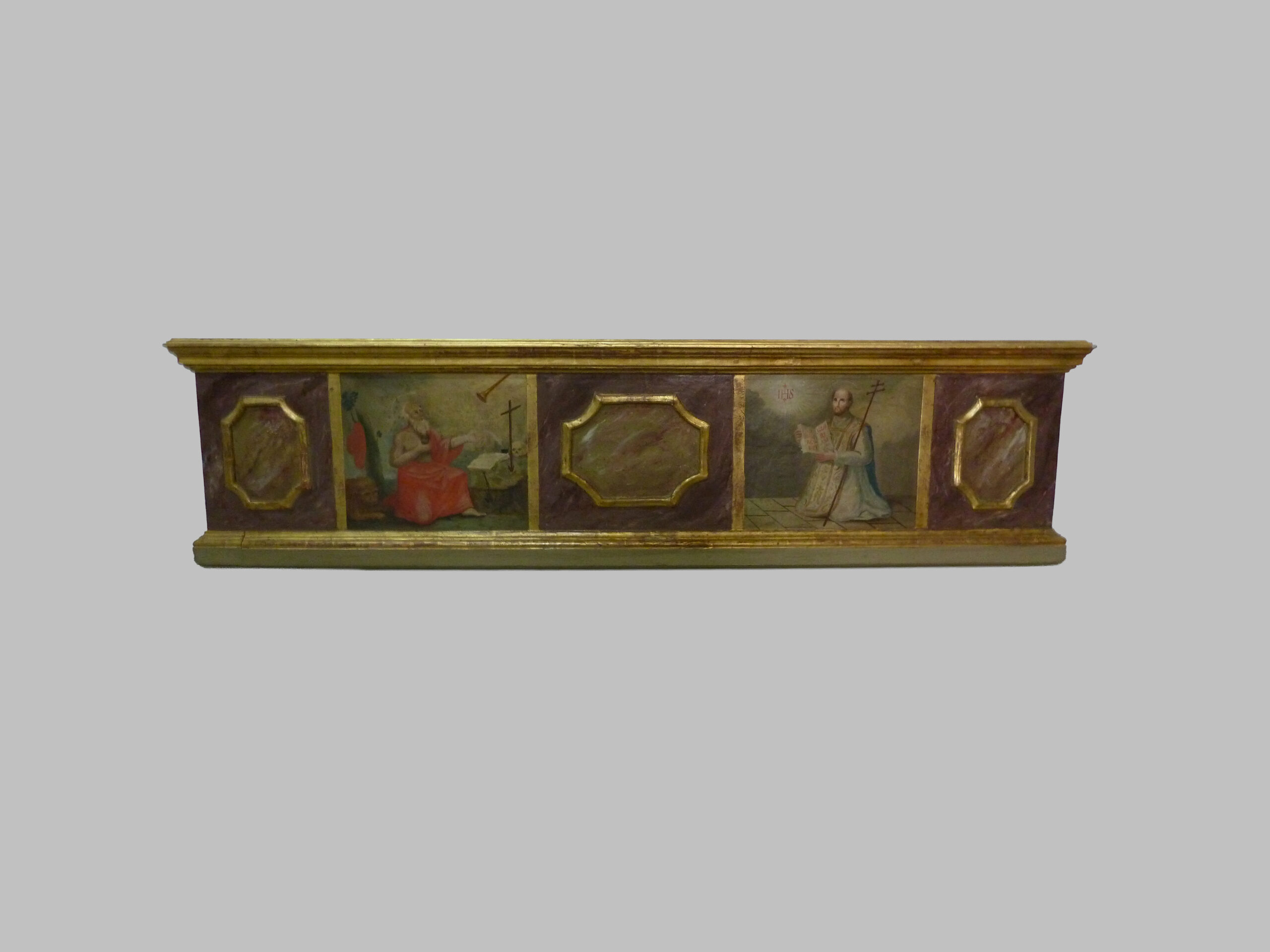 Frontal decorativo de madera, compuesto por cinco placas talladas y policromadas con imágenes de santos, datado en el siglo XVIII, que refleja la devoción y la tradición artística religiosa de la época.