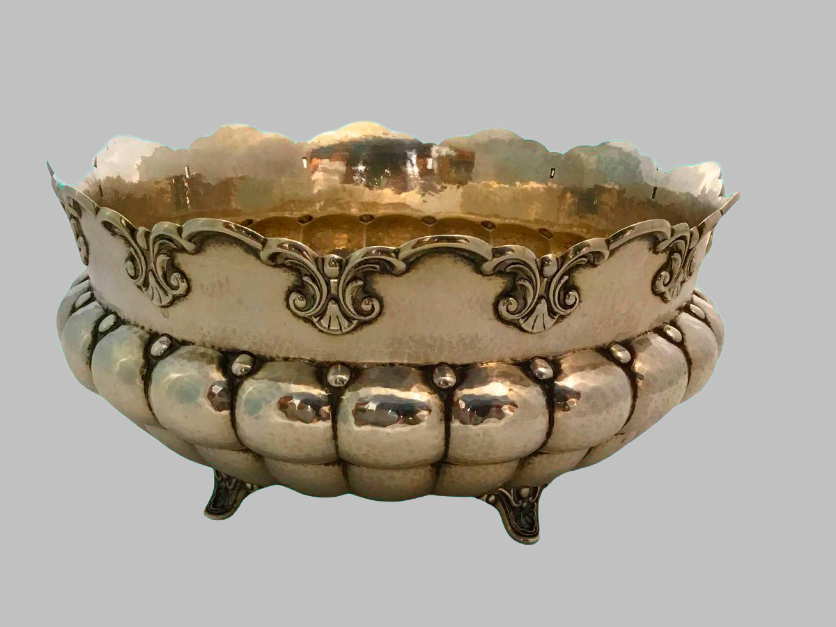 Elegante frutero de plata española de forma circular, apoyado sobre cuatro pies, característico del diseño del siglo XX.