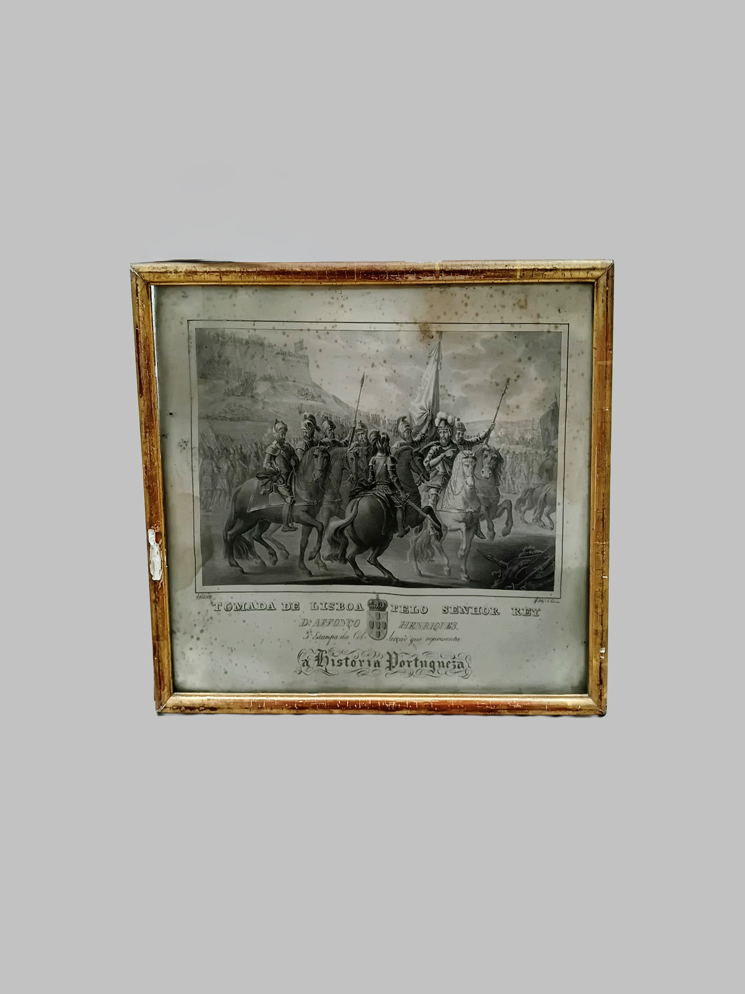 Grabado histórico titulado “Toma de Lisboa”, enmarcado en un elegante marco dorado que aporta distinción y realce visual a la obra. Este grabado captura un momento de relevancia histórica, combinando detalle artístico y narrativa visual.