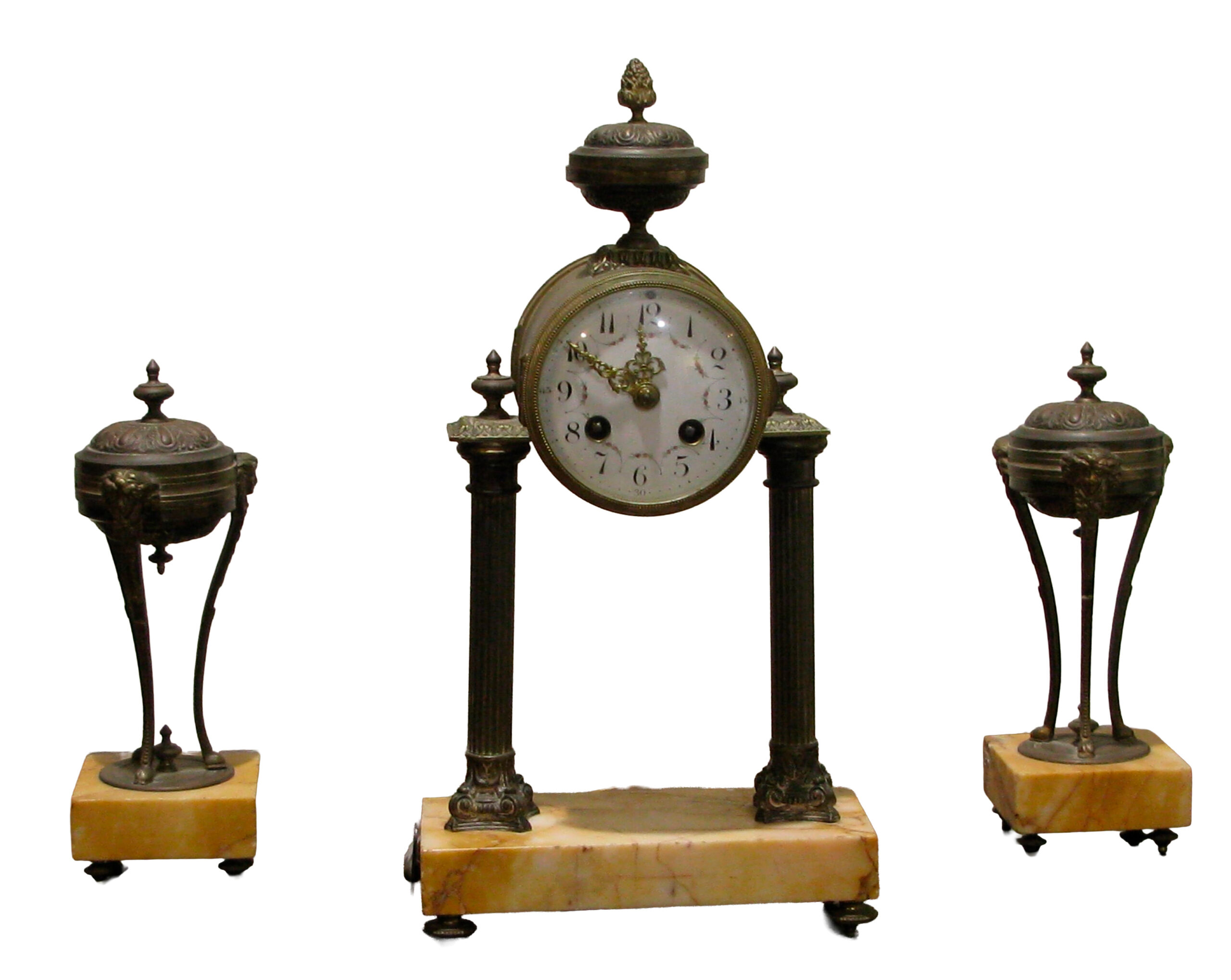 Guarnición de Reloj y dos Copas de bronce con base de mármol. Francia, S. XIX