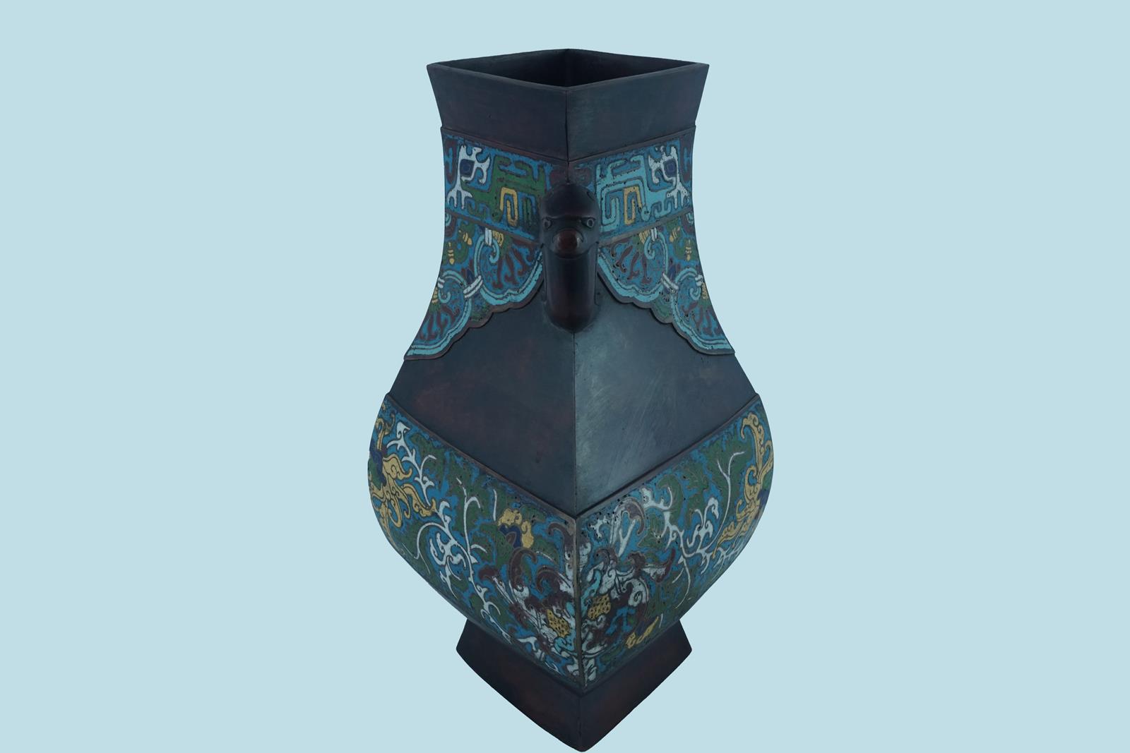 Excepcional jarrón chino de bronce esmaltado con técnica Cloisonné, de forma romboidal con dos asas laterales, decorado con motivos étnicos y florales policromados en tonos azules, amarillos, blancos y verdes. Esta pieza, datada en el siglo XVII, refleja la maestría artesanal de los talleres chinos de la época, donde el Cloisonné alcanzó su máxima expresión como arte decorativo de lujo.