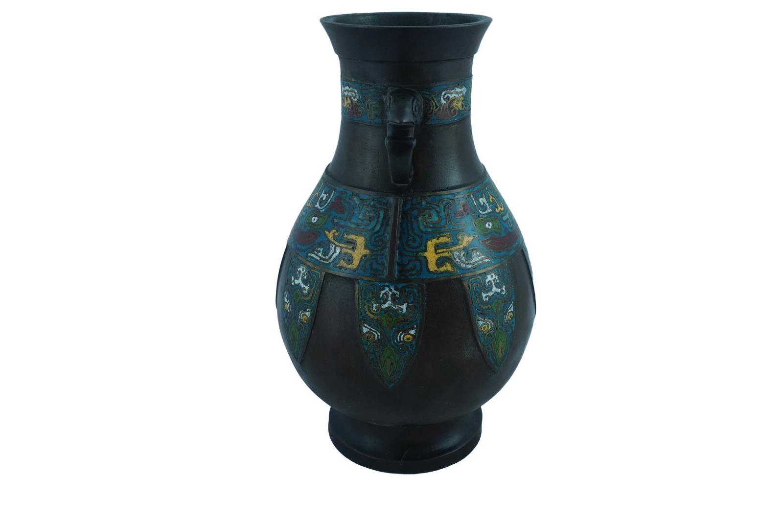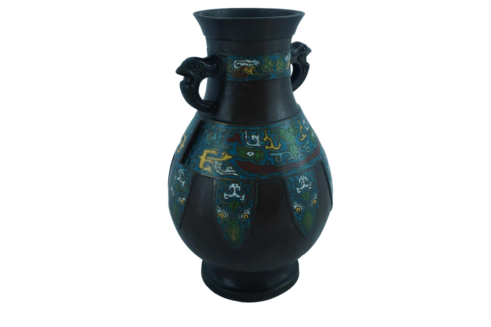 Jarrón chino de metal esmaltado con técnica Cloisonné, decorado con motivos étnicos y policromado en tonos azules, amarillos y verdes, con dos asas pequeñas y boca ancha.